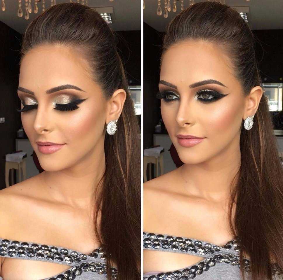 - Красивый вечерний макияж со стрелками — беспроигрышный вариант для любого мероприятия: чёрные и изящные — для деловых встреч, ультратонкие и кокетливые — для романтических свиданий, дерзкие, с глиттером — для вечеринок с друзьями.