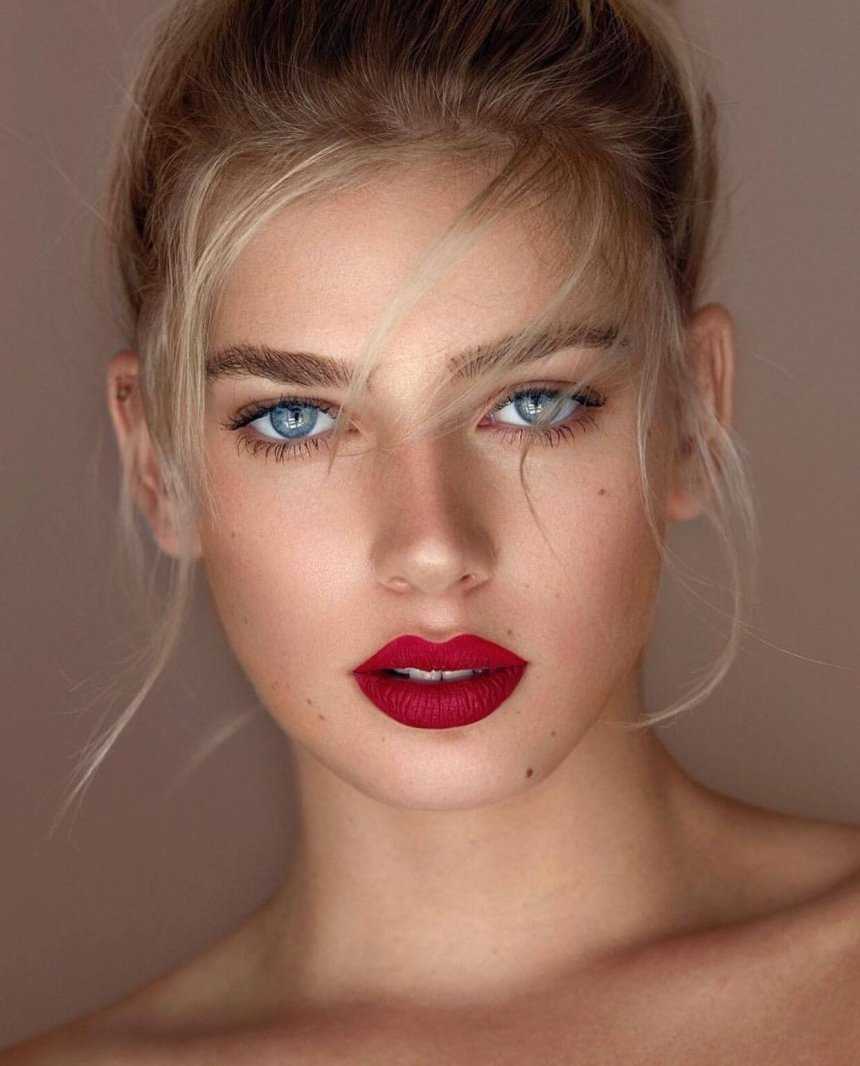 - Девушки с голубыми глазами обычно подбирают помаду цвета вишни или же алую.