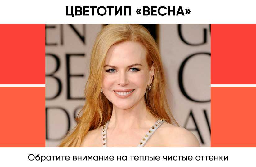Вы «весна», если: вам идет серый, молочный, персиковый цвета, золотые украшения, а не серебряные. У вас золотистые или пшеничного оттенка волосы, зеленоватые вены, нежно-персиковая кожа, возможно, веснушки, серые или зеленые глаза. Вам подойдут яркие цвета — такие, будто бы их касались лучи солнца.