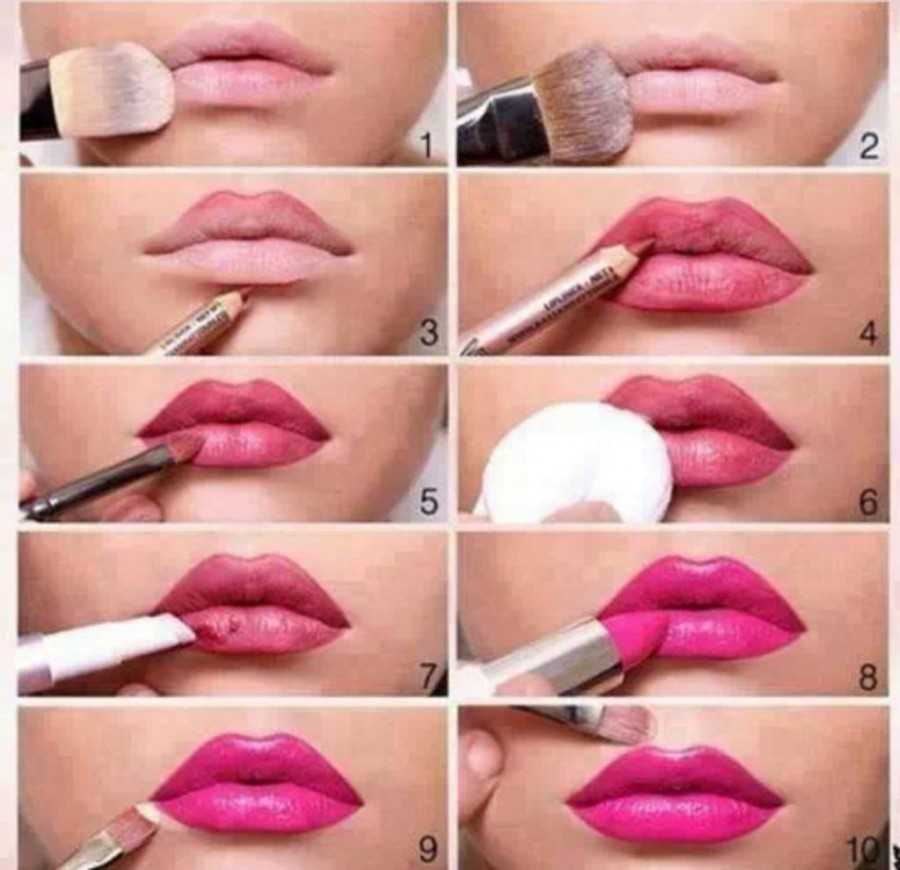 - Последний этап- нанесение губной помады или блеска для губ. Цвет должен подходить под оттенок кожи и сочетаться с цветом румян. Наносите ее, двигаясь от центра губ к внешним уголкам.