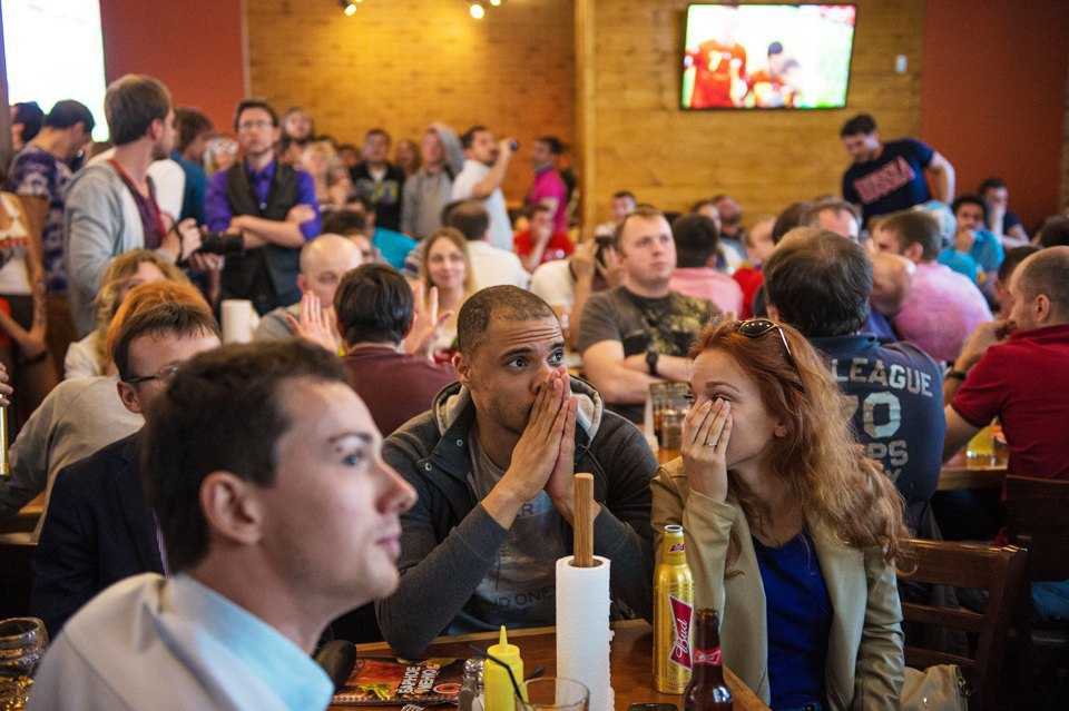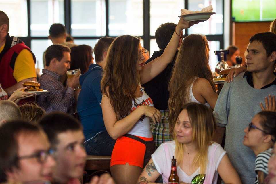Страх сковывает: мы вышли из офиса, оставив мир текстов, съёмок и редакционных планёрок, чтобы погрузиться в пучину куриных крыльев, футбола и женских грудей. Нужно подойти к незнакомым людям и продать им бекон, сыры, перцы халапеньо и бог знает что ещё. А что делать, если кто-то схватит нас за попу? Или за грудь? Или начнёт приставать? Менеджер уверила нас, что гости в Hooters ведут себя прилично и таких случаев у них не бывает. Хотя на всякий пожарный здесь есть охрана.