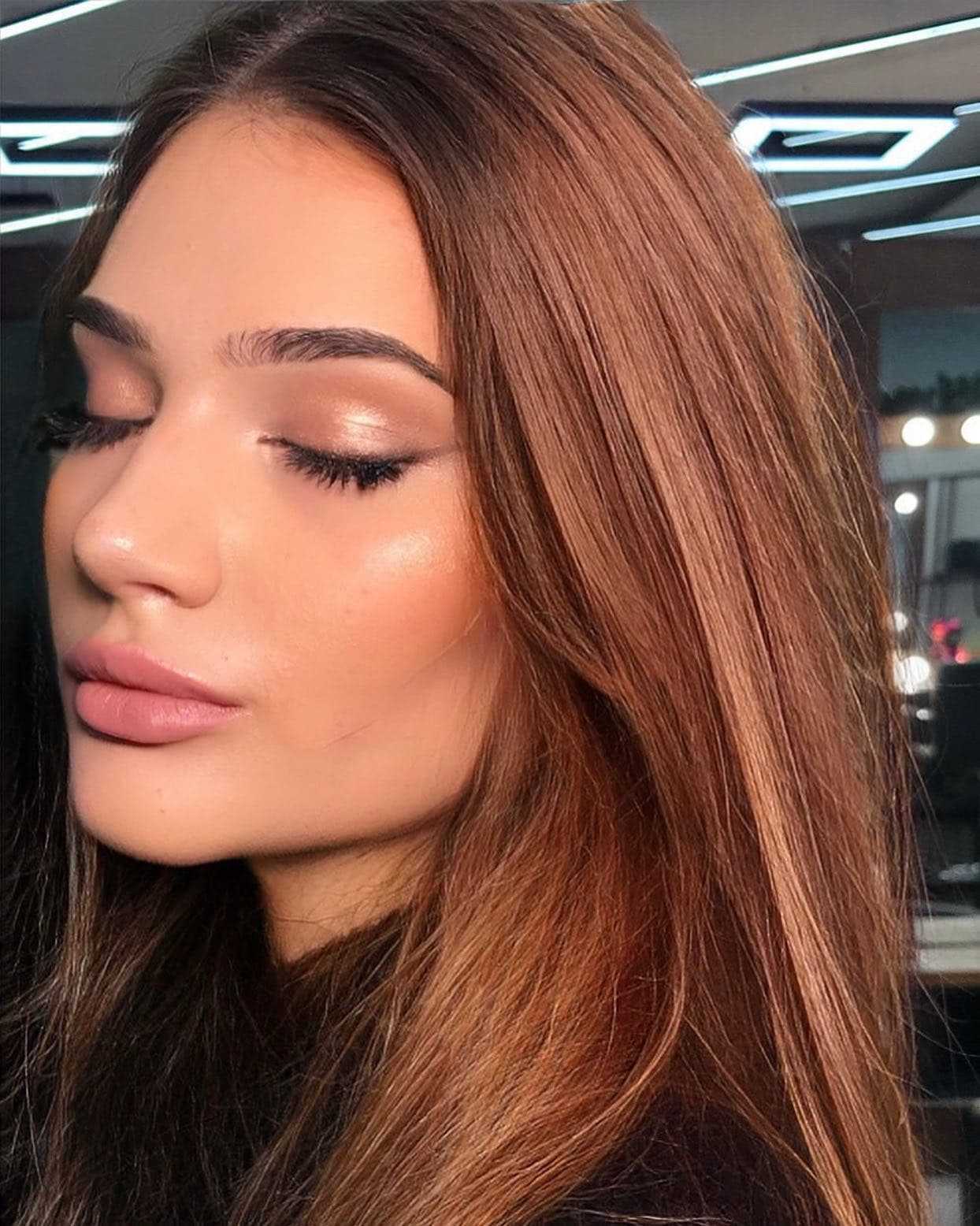 Коричневая гамма с бронзовыми переливами будет идеальным решением для осеннего образа. Можно смело добавлять сияние векам, скулам и губам в общем макияже.