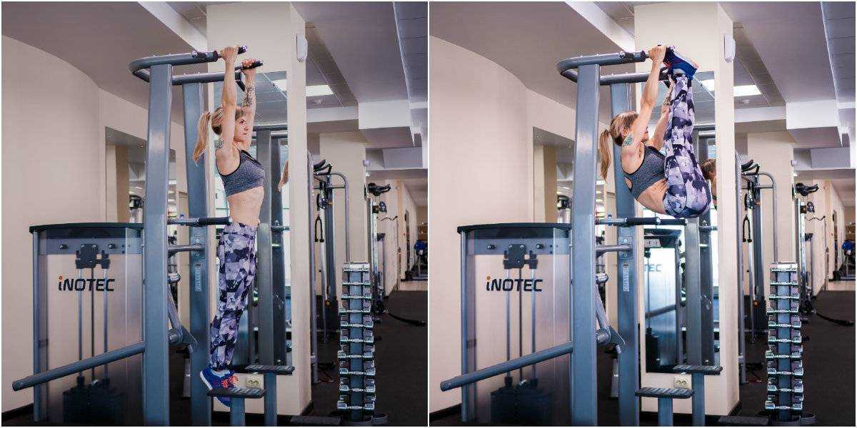 Повисните на турнике прямым хватом, сведите лопатки. Поднимите ноги и коснитесь носками турника, вернитесь в исходное положение. Можете немного сгибать колени и отводить плечи назад.