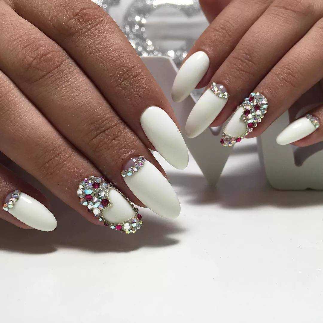 Изюминка идеи – ноготь на безымянном пальце, который покрывается белой решеткой, в окошки которой вставляются сияющие камушки или бусины. Они выбираются в соответствии с размерами рисунка: если он крупный, то и стразы выбираются покрупнее, и наоборот.
