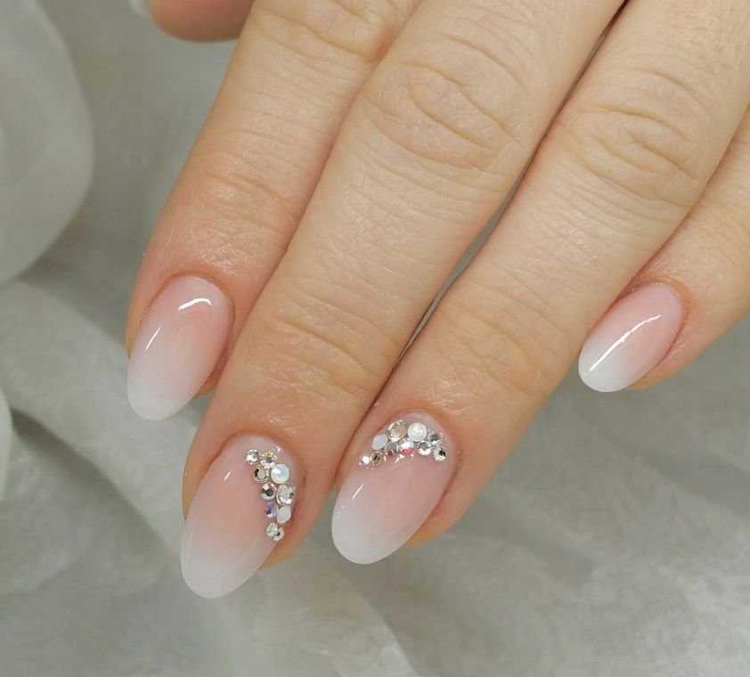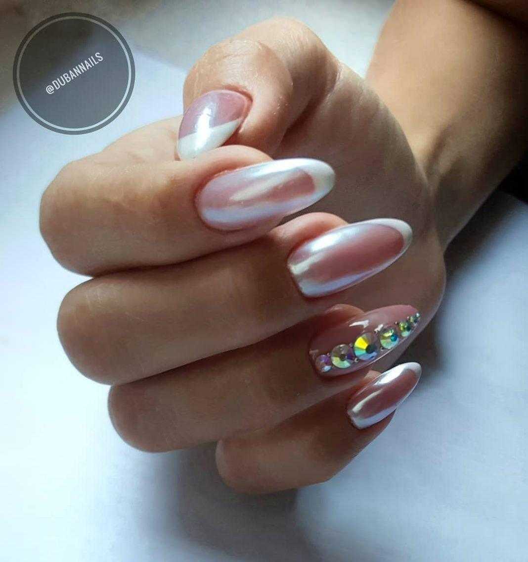 Идеальный оттенок камней – перламутровый. Он не так банален, как серебряный, который используется в большинстве задумок, и хорошо вписывается в бело-розовую цветовую гамму. Однако стоит учесть нюанс – блестки с лиловым или фиолетовым отливом будут уместнее, чем с желтым или зеленым.