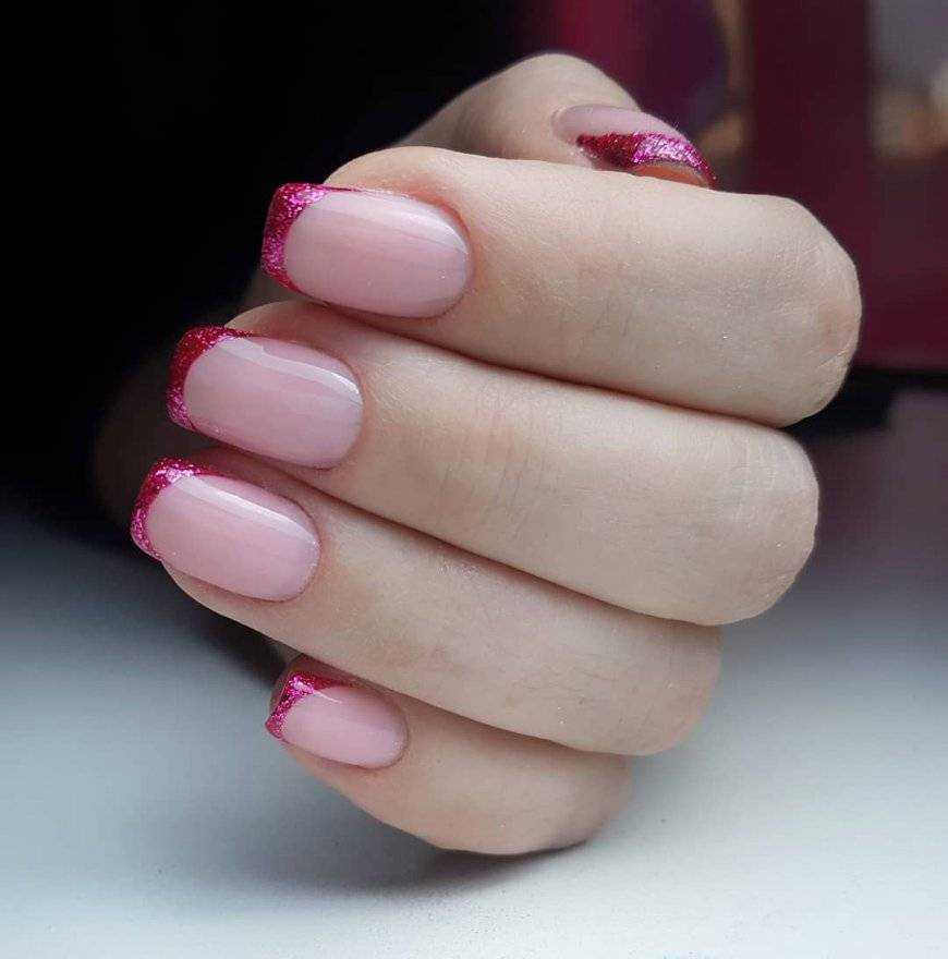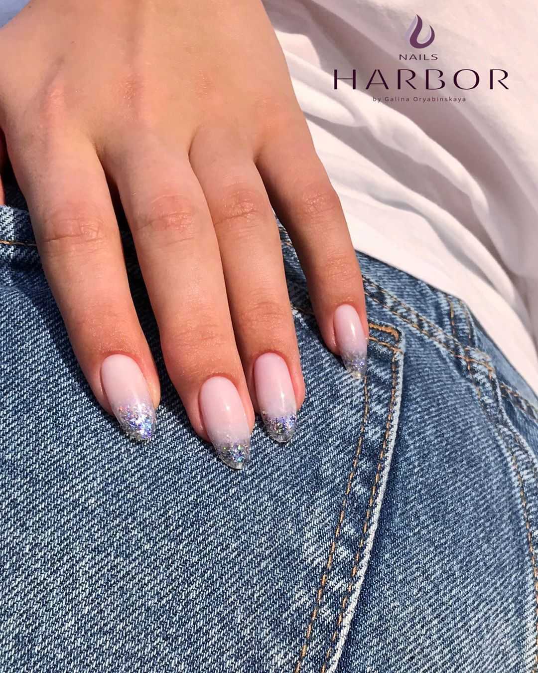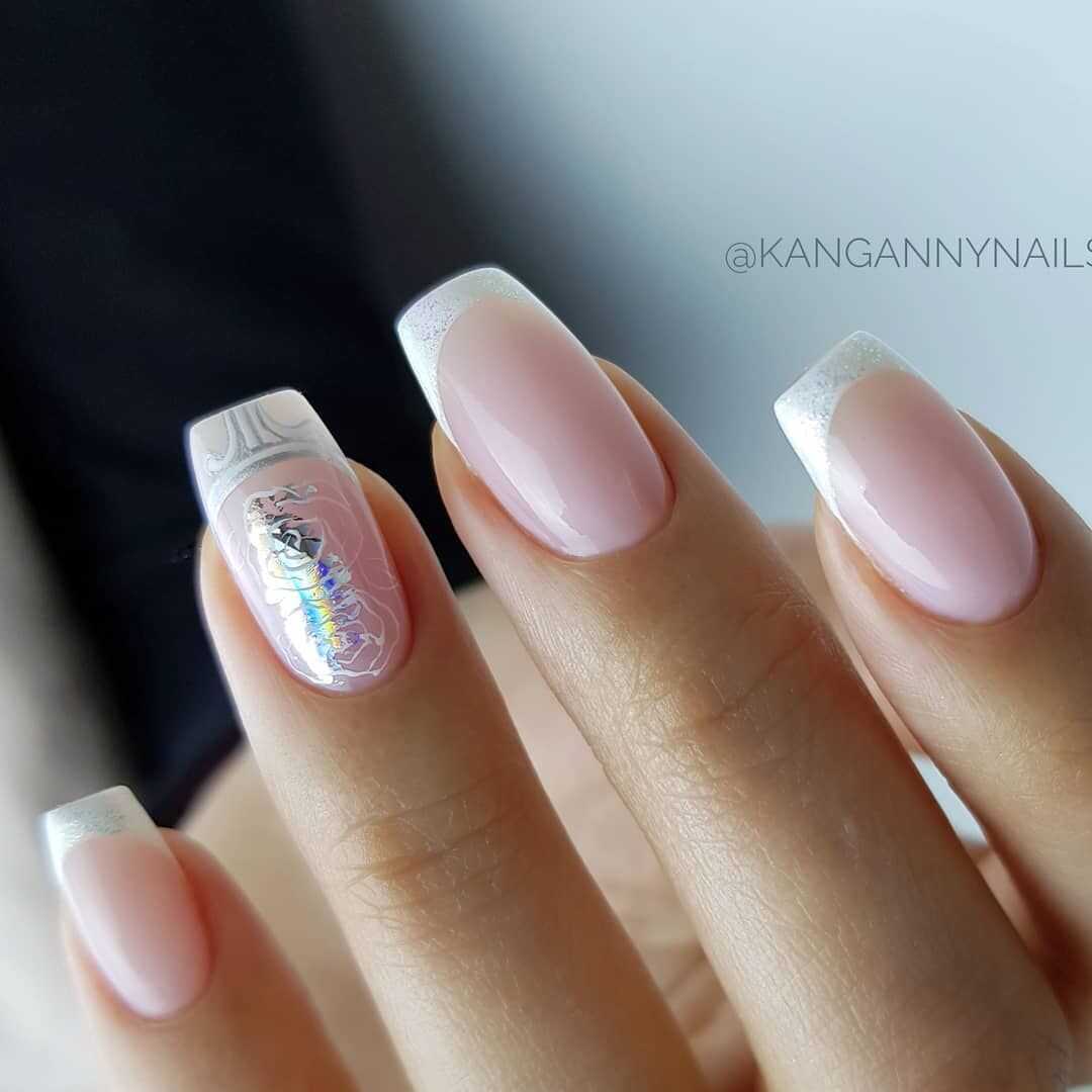Если же классики становится недостаточно, свое внимание стоит обратить на прозрачный френч с блестками. Такой вид маникюра подойдет для какого-то особенного мероприятия, где нужно выглядеть одновременно сдержано и незабываемо