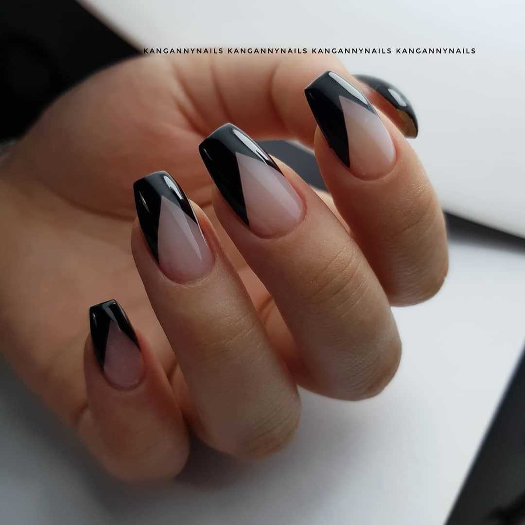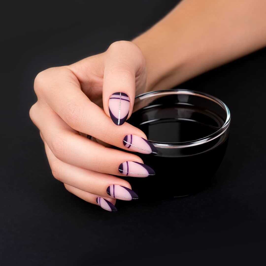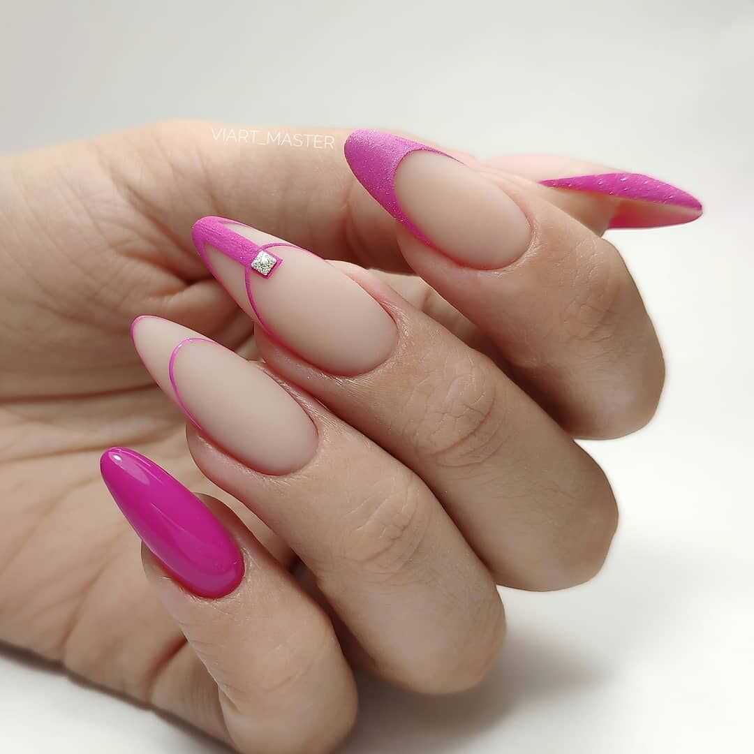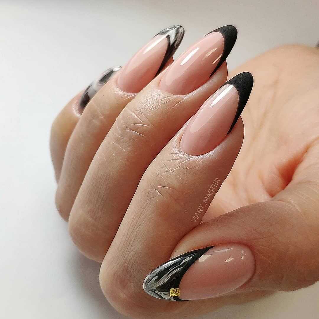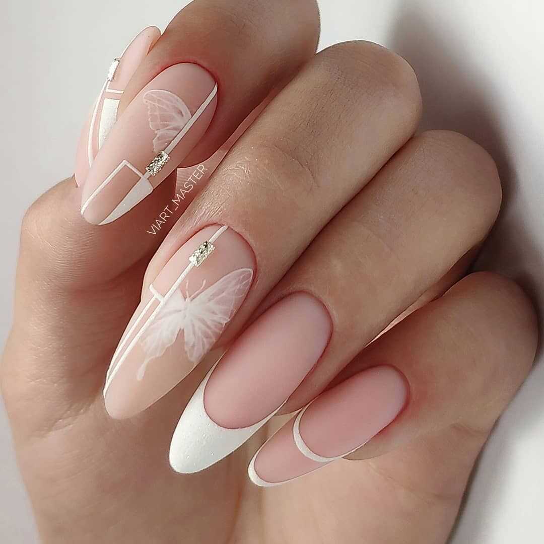 Не менее красивый вариант может быть выполнен на длинных ногтях. Для этого потребуются базовые цвета – белесый и розоватый, однако задумка далеко не классическая и подойдет уверенным в себе женщинам, которые не боятся экспериментировать и выглядеть смело. Наиболее выигрышно она будет смотреться на острых ногтях, потому что предполагает окантовку, начало которой лежит на основании пластины, конец – на краю. Таким образом получается нечто, похожее на треугольник с острой вершиной.