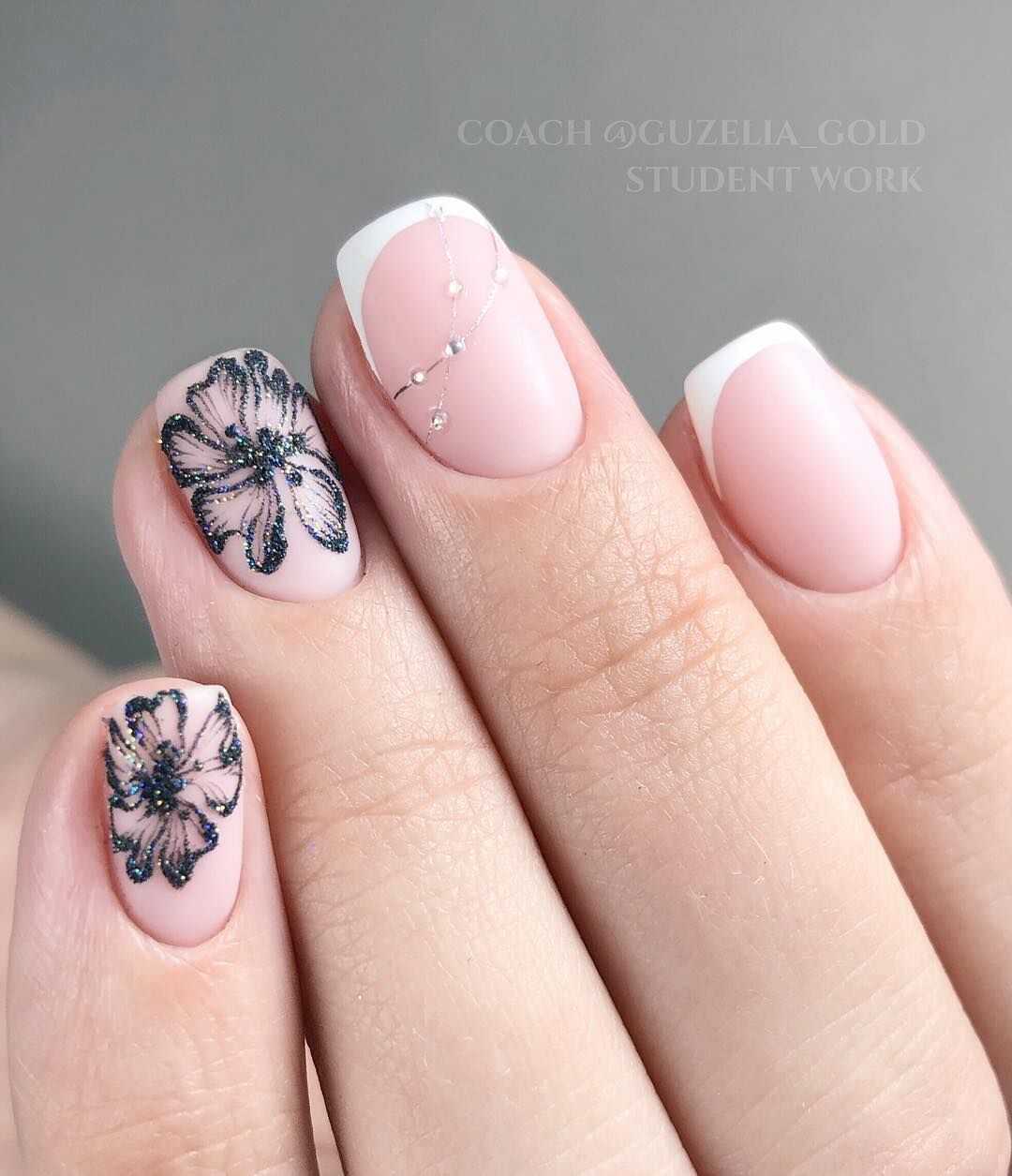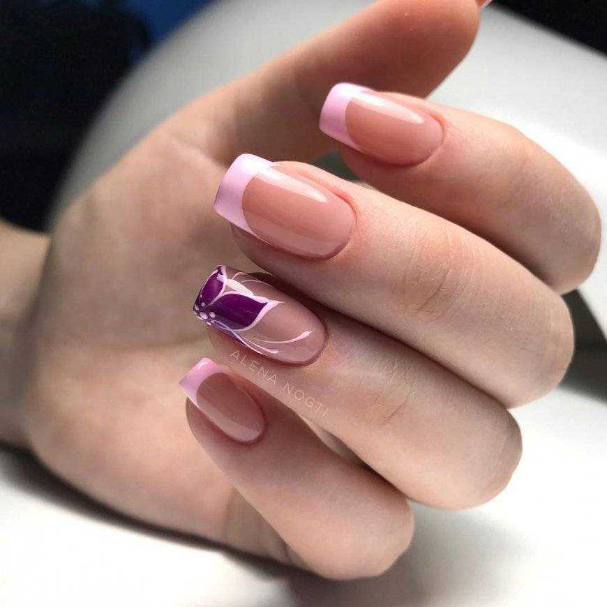 На коротких ногтях будет отлично выглядеть френч с рисунком, например, с цветами, выполненный на базе сиреневого цвета