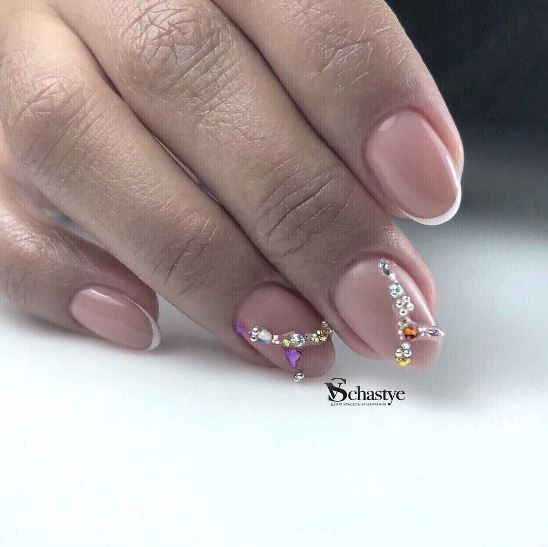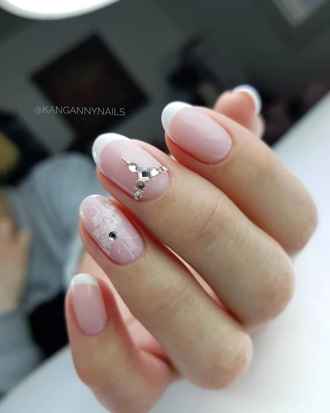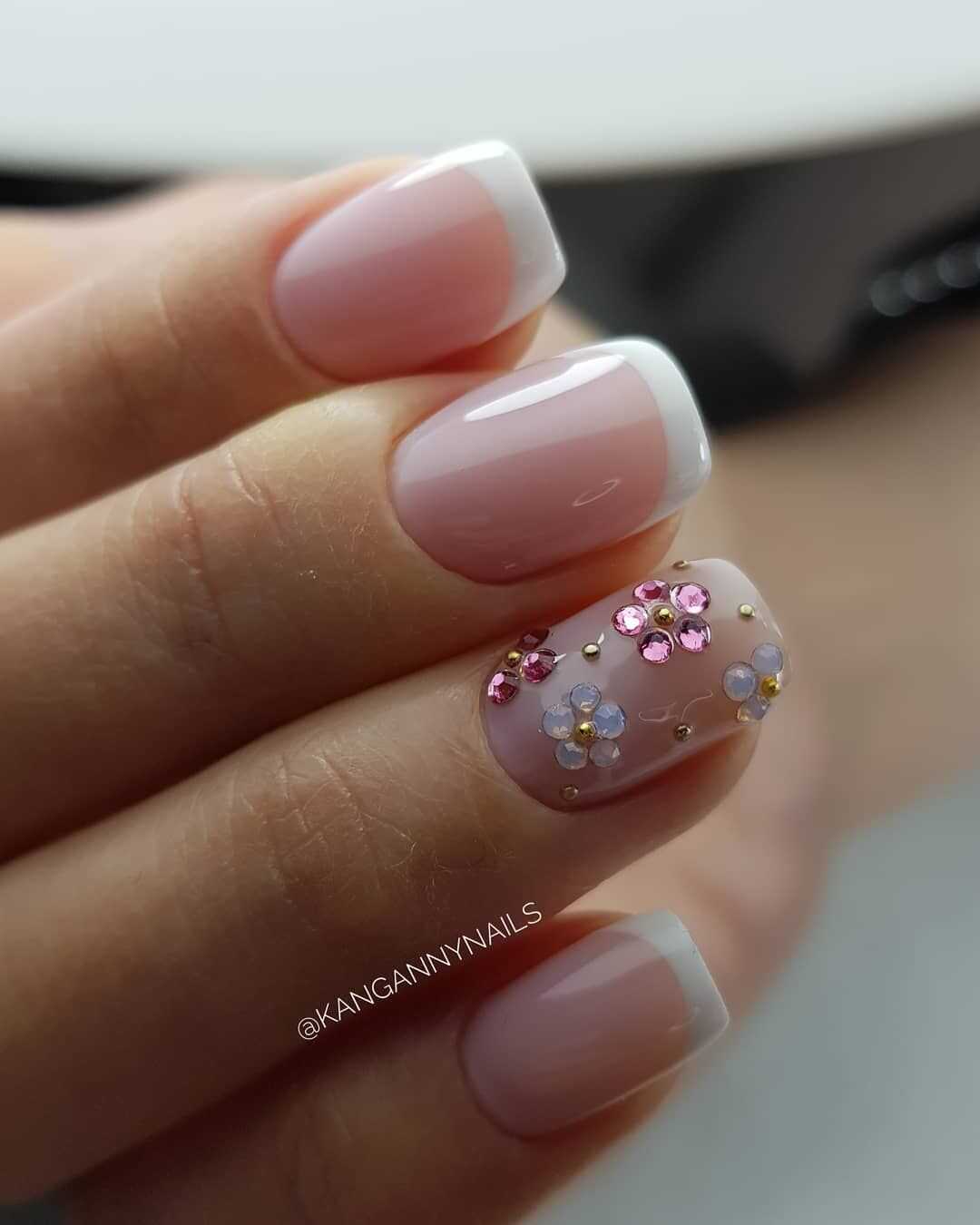 Камушки должны быть маленькими и едва заметными, чтобы не выглядеть как нечто инородное в этом легком и сентиментальном маникюре, который отлично подойдет молодым девушкам и романтичным натурам и будет неплохо смотреться с вечерним платьем в подходящей цветовой гамме – фиалковой, аметистовой