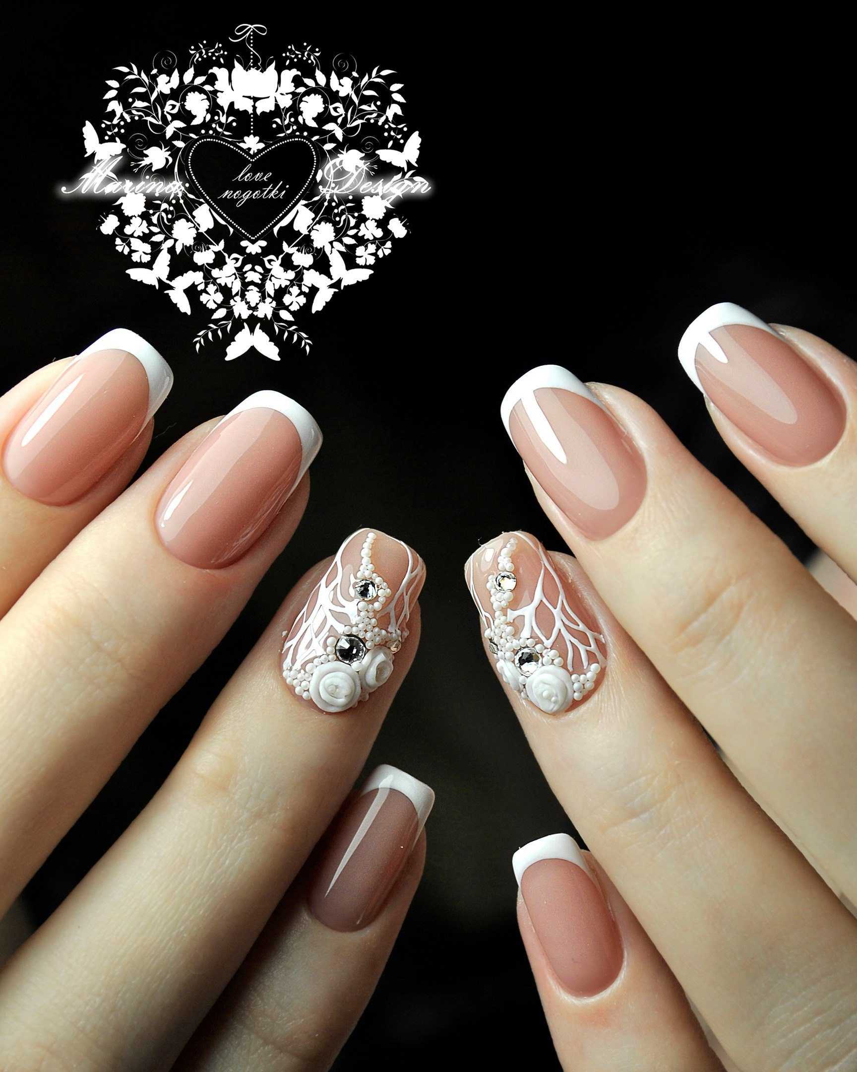 Белый френч со стразами – классический вариант оформления ноготков невесты. Никакие другие нейл-арты не будут выглядеть в этот торжественный день столь же нежно и мило, чем белый френч. Вариант маникюра для невесты обговаривается заранее, здесь нет места импровизации и экспериментам. Дизайн должен быть выполнен таким образом, чтобы он нравился не только невесте, но и сочетался с остальным образом. Для этого используется кружево со свадебного платья, которое размещают на ноготках и обильно украшают крупными стразами Сваровски.