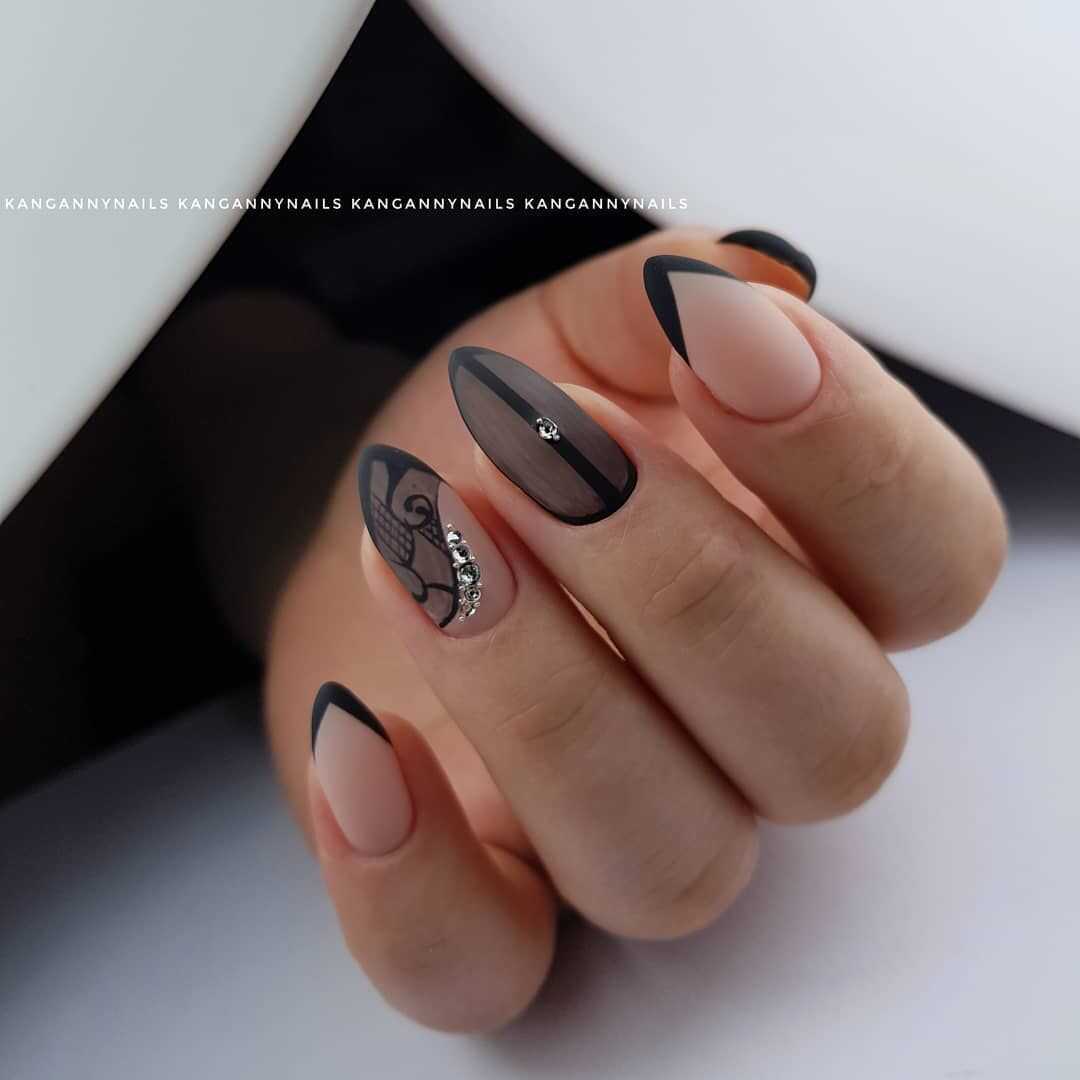 Френч с полупрозрачной зоной улыбки поможет подчеркнуть креативный вкус женщины. Такую технику можно украсить стразами, геометрией или другими интересными вариациями декора, а также узорами.