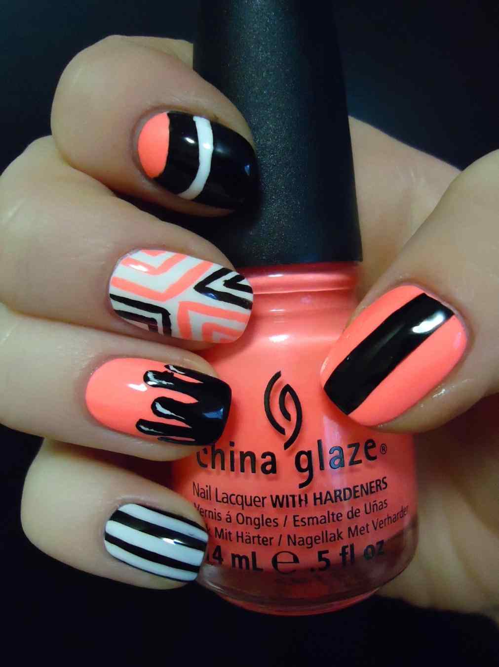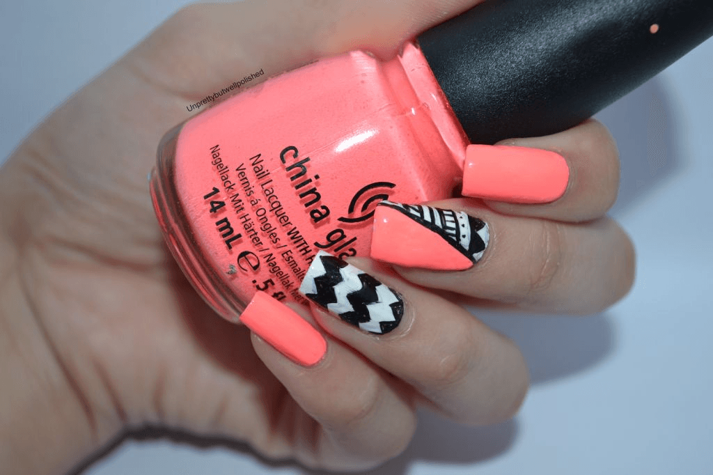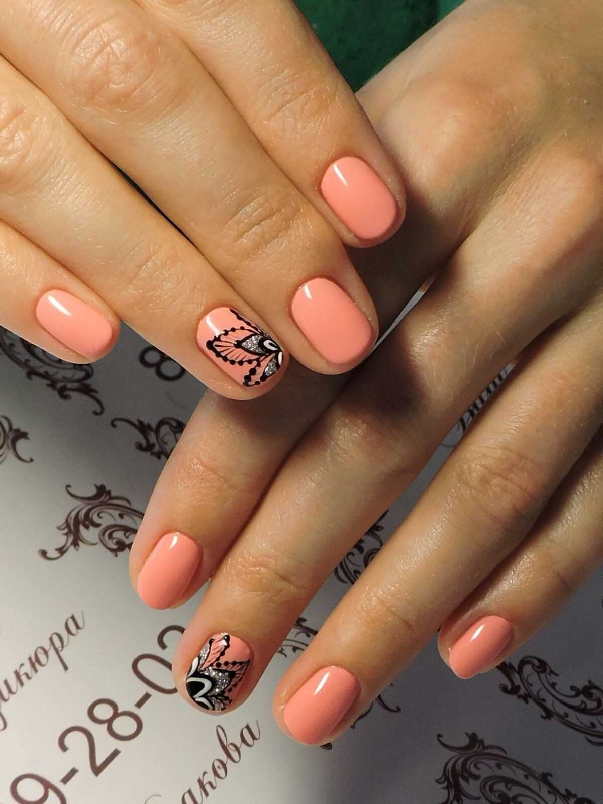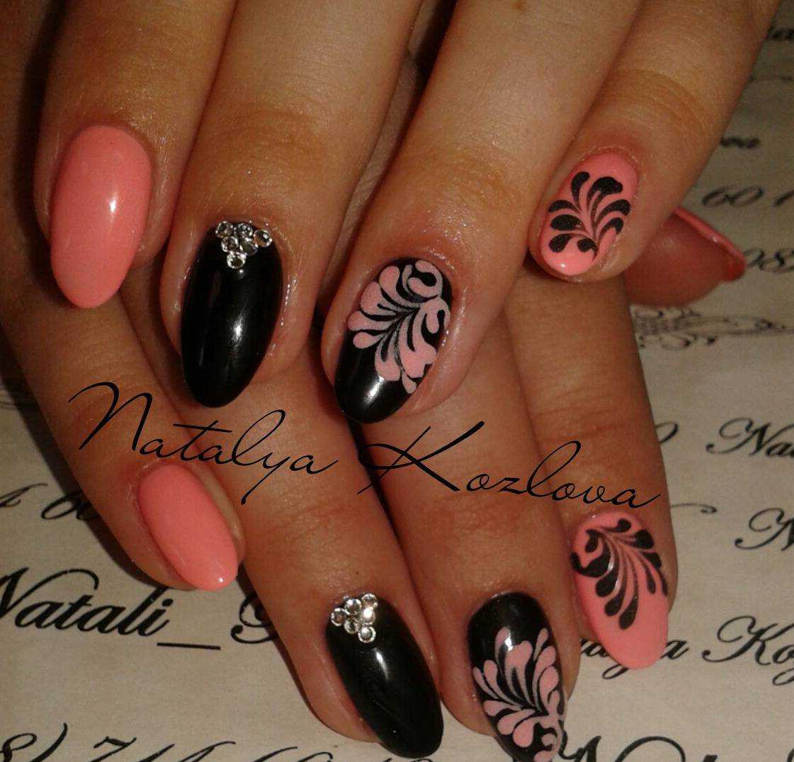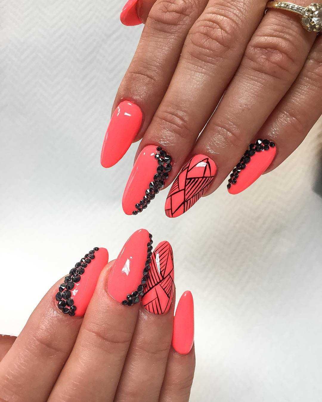 В коралловом маникюре с черным цветом важно помнить об умеренности. Заранее продумайте свой нейл-арт или имейте готовый образец