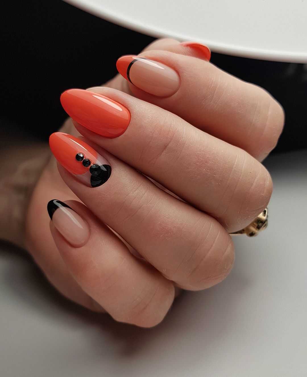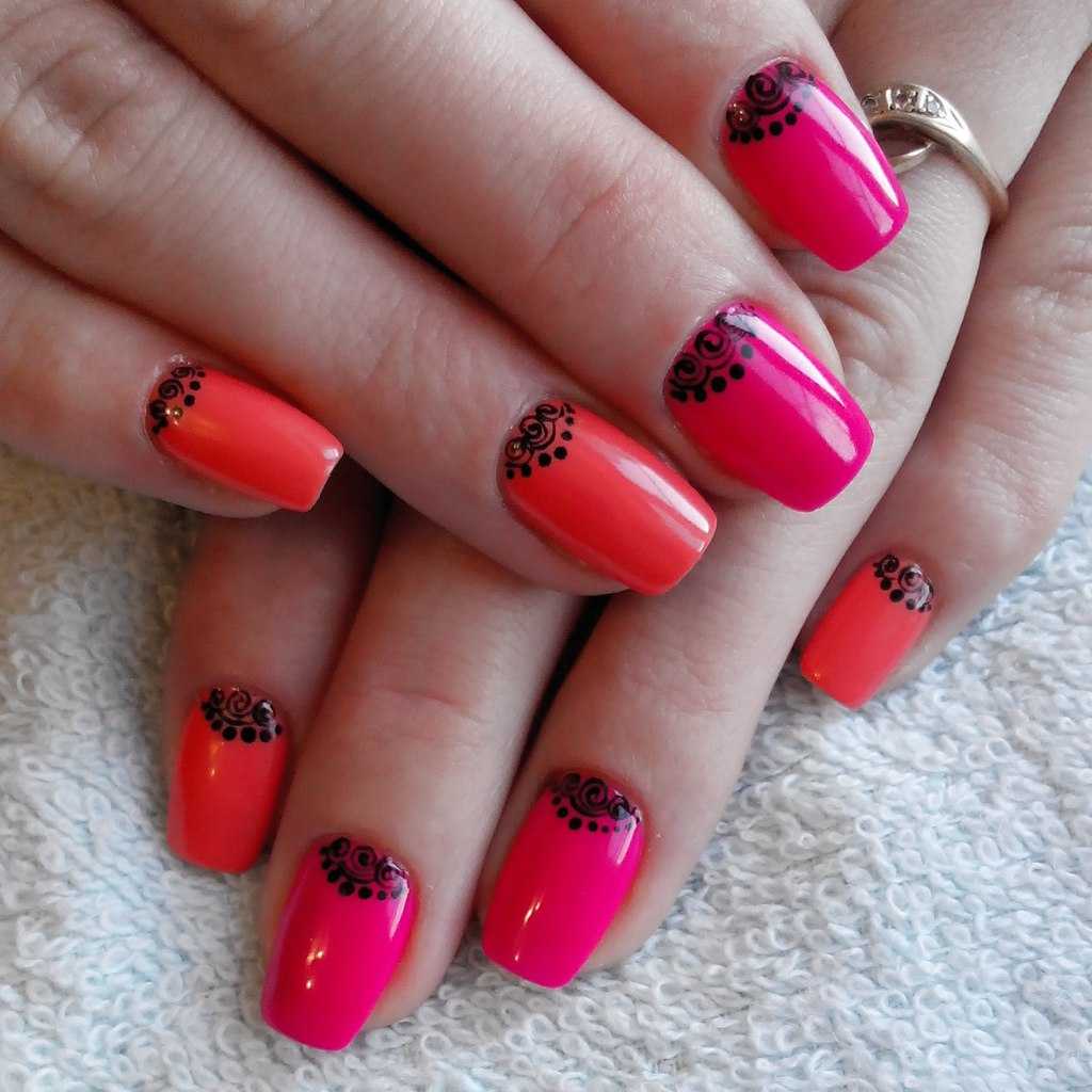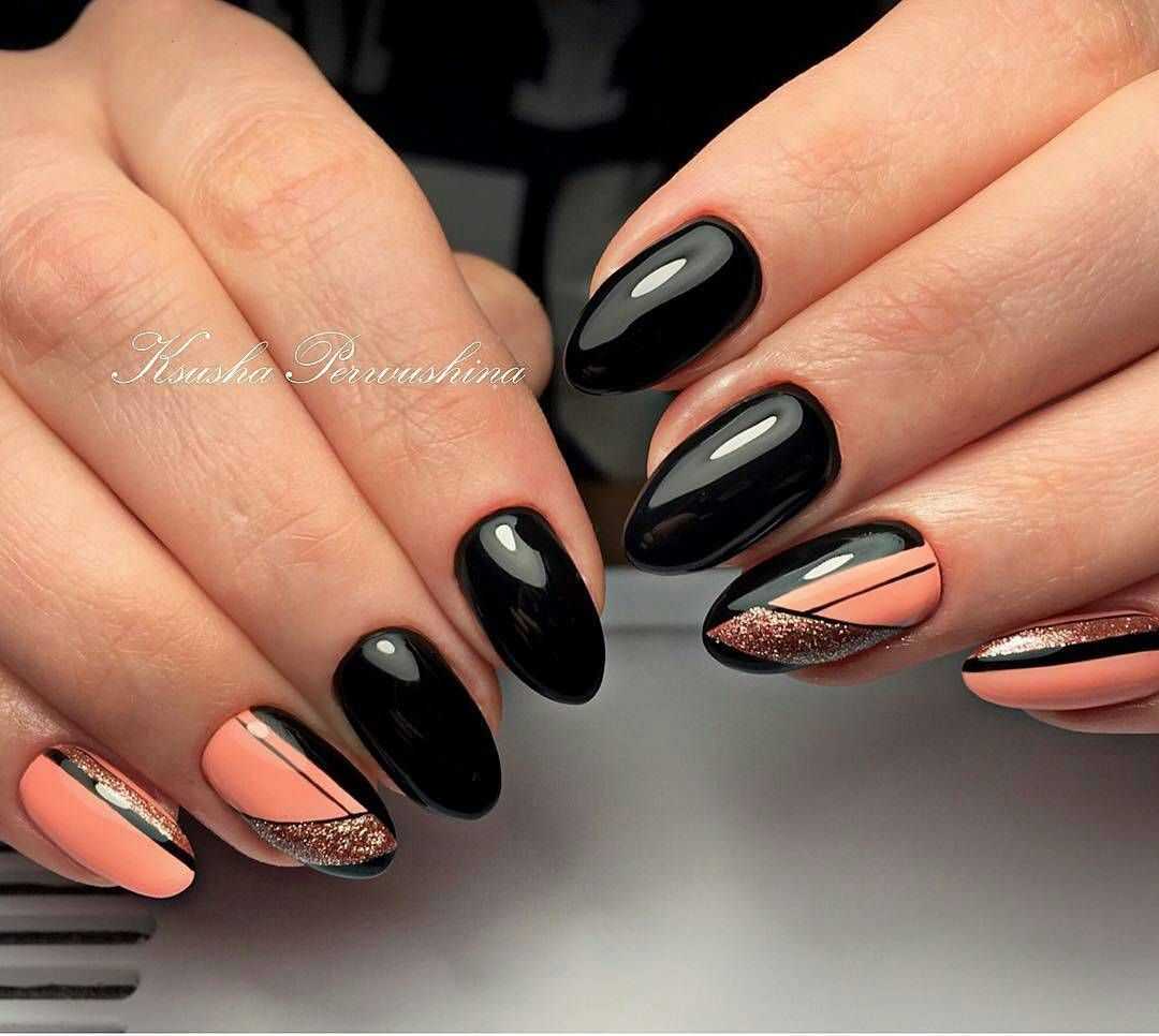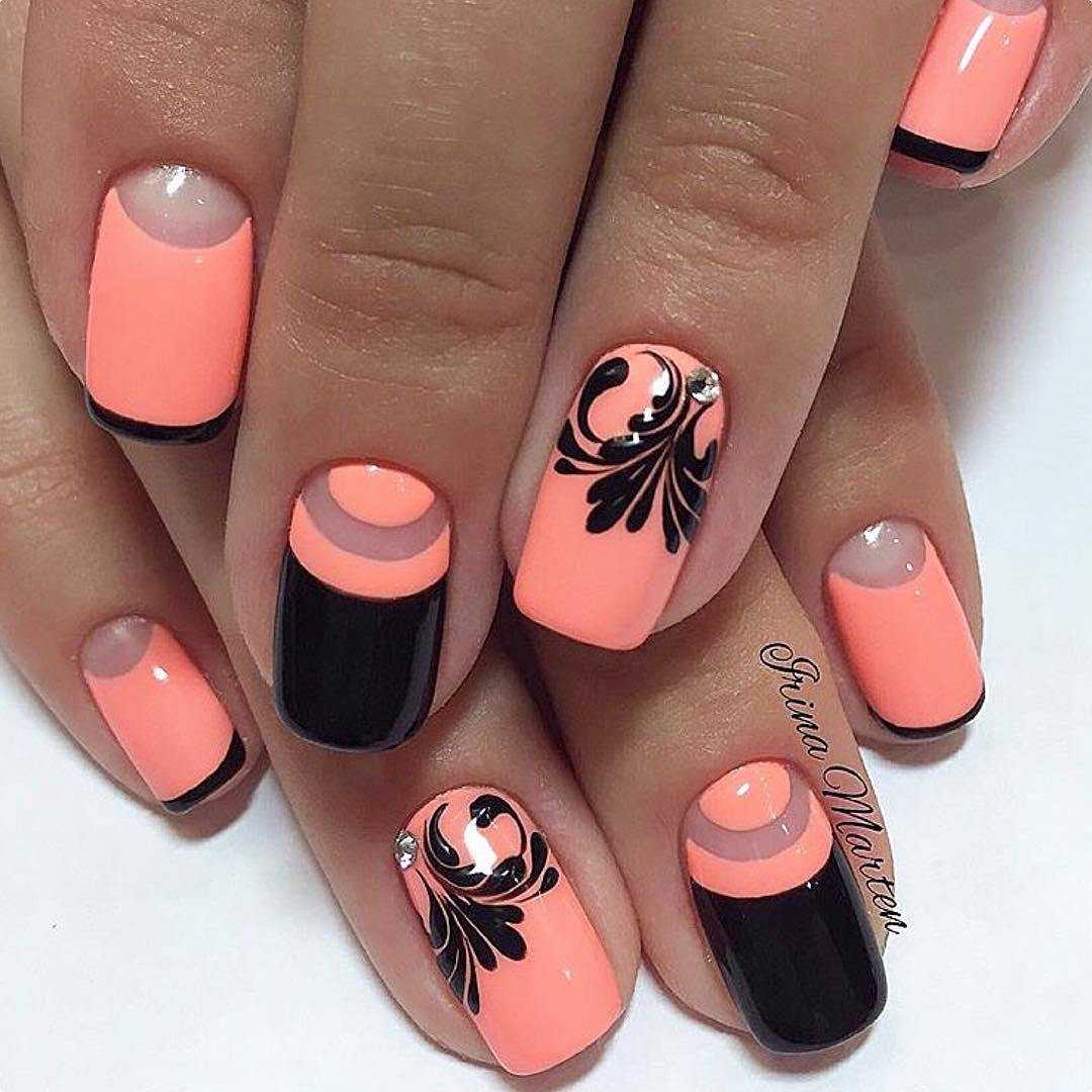 Стильный коралловый маникюр с черным цветом 2020