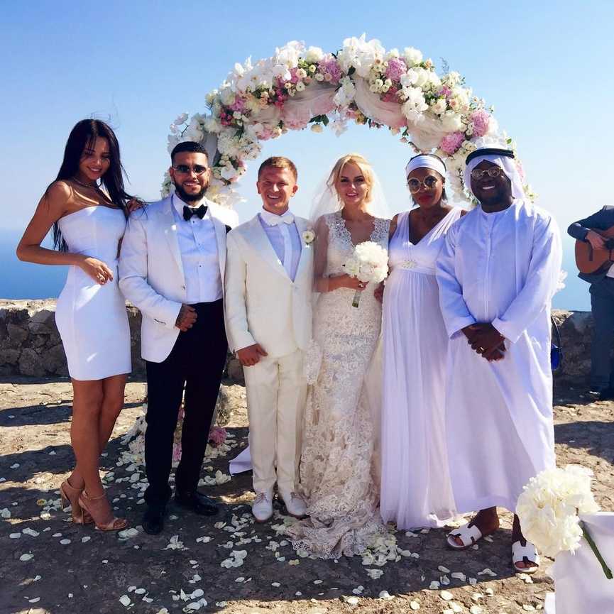 С местом проведения церемонии пара определилась заранее. Их выбор пал на остров Капри, где они уже неоднократно отдыхали. Ханна сама придумала для себя свадебные образы. Девушка приобрела роскошное платье, выполненное из кружева ручной работы. А для прогулки по острову выбрала короткий наряд с фатой. Гости были одеты в белое. Место проведения церемонии украсили множеством живых цветов (орхидеи, пионы, розы и гортензии).