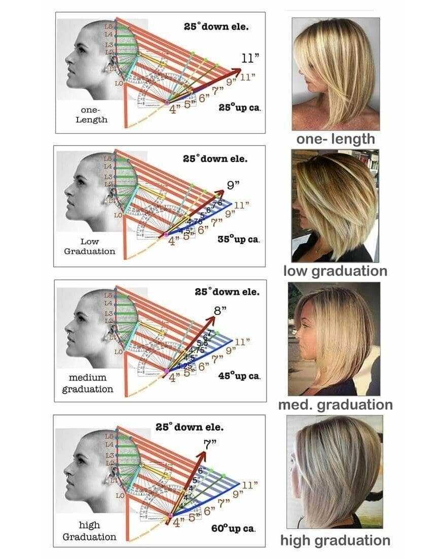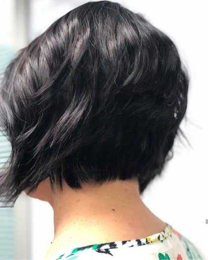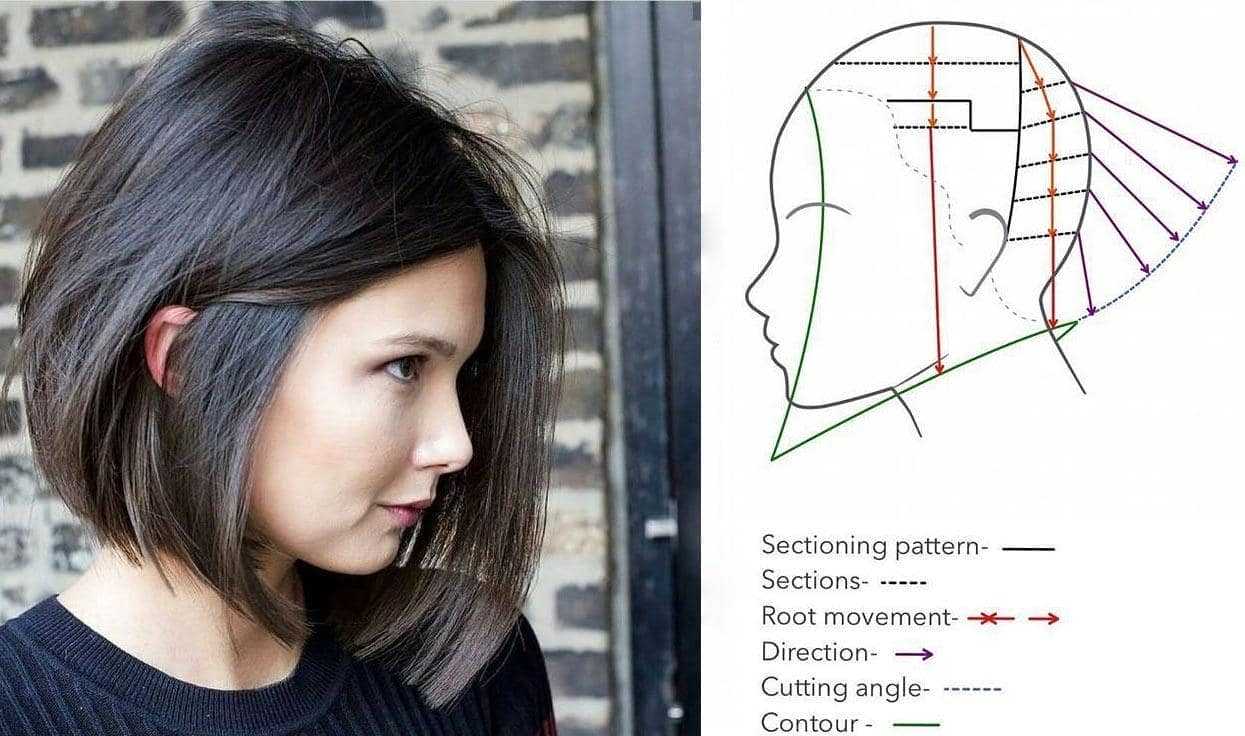 - От затылка до подбородка пряди стригутся наискось. Сзади короче, впереди длиннее;