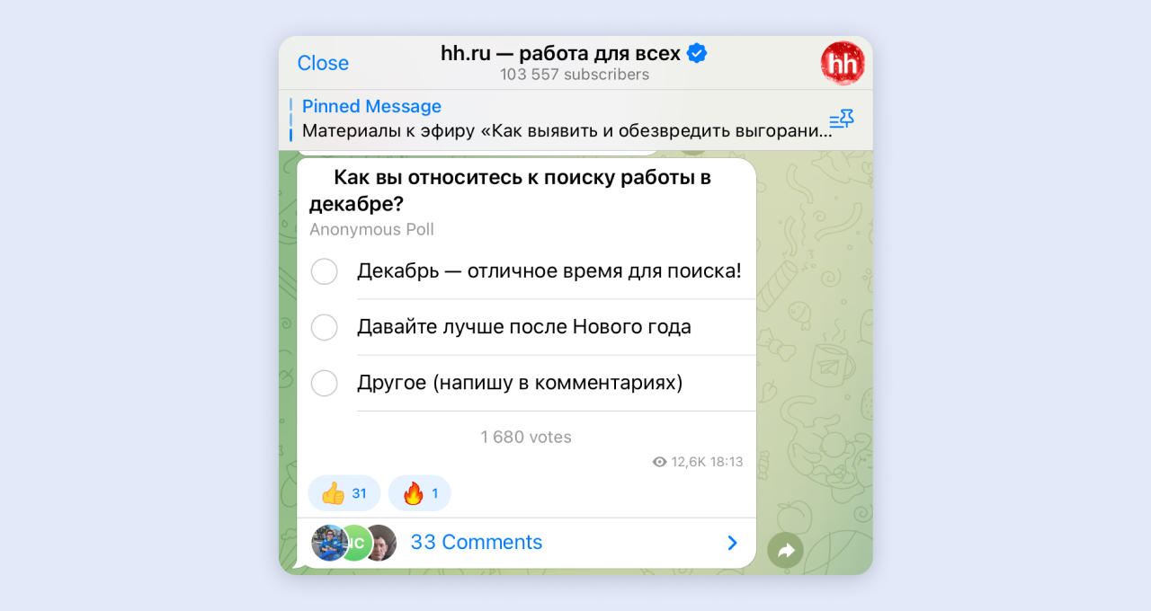 Голосования похожи на опросы, но требуют еще меньше усилий со стороны подписчиков — им нужно просто нажать на нужный вариант, а после можно посмотреть результаты. Если вы только начинаете вести канал, начните с голосований — люди охотнее участвуют в таких «быстрых» активностях.Провести голосование можно на любую тему, которая может зацепить подписчиков.Например, сервис для поиска работы HH.ru часто задает в своем канале вопросы про поиск работы, тем самым лучше изучая свою целевую аудиторию.