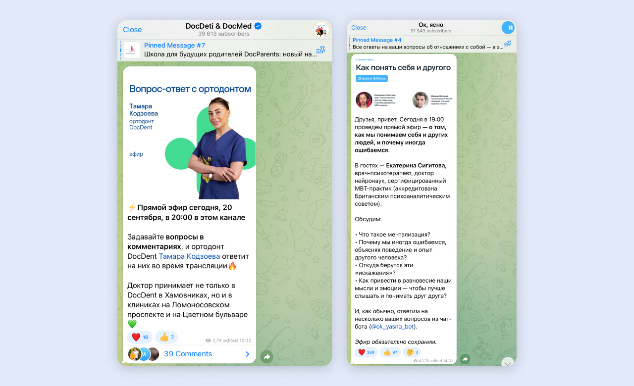 Прямой эфир — это видеотрансляция в мессенджере, которую можно смотреть в режиме реального времени и общаться со спикерами с помощью комментариев. В телеграмме эта функция появилась относительно недавно, но быстро стала популярной среди компаний. На прямых эфирах обсуждают заранее выбранную тему и отвечают на вопросы подписчиков. Чаще всего прямые эфиры бывают полезны в «помогающих» сферах вроде психологии, медицины или образования, но придумать интересную тему можно в любом бизнесе.