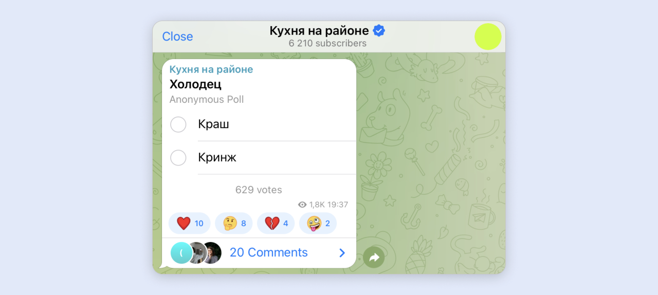 А сервис для доставки продуктов «Самокат» проводит развлекательные интерактивы в своем канале. Как видите, опросы для Телеграм-канала можно делать на абсолютно любые темы — главное, чтобы они могли привлечь внимание именно вашей аудитории и соответствовали повестке дня. Если вы ведете корпоративную группу в Телеграм, используйте те же методы — спросите, какие посты сотрудники хотят видеть, обсудите актуальные вопросы и проблемы.