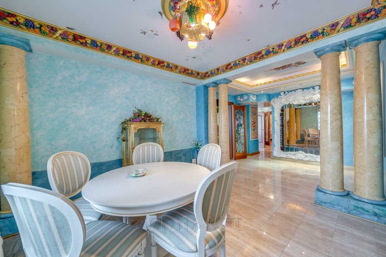 Квартира в Санкт-Петербурге выполнена в классическом дворцовом стиле, с использованием лепнины и действительно напоминает сказочный дворец. Большие многоярусные люстры, высокие потолки (5,3 метра), тяжелые портьеры, золоченые бра, великолепная лестница, а также мебель и сантехника в античном стиле.