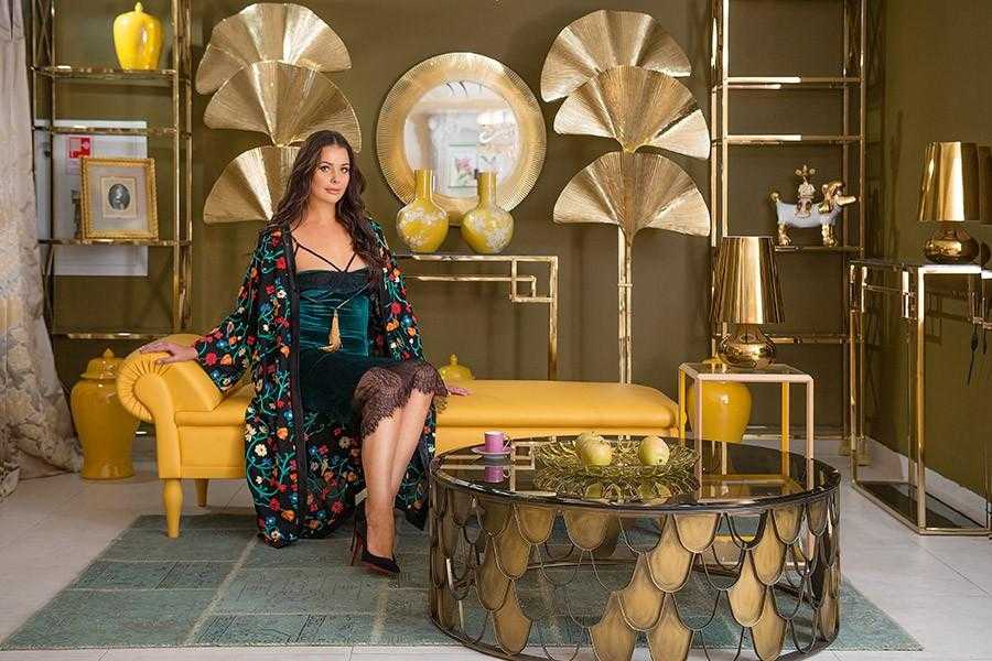 В новой квартире была особенность в виде террасы, с которой открывался вид на город. А Оксана прибегла к весьма необычному интерьеру. Гостиная была выполнена в бронзовых и золотых оттенках. Яркими пятнами выступали отдельные детали насыщенно желтого цвета: тахта, декоративные вазы.