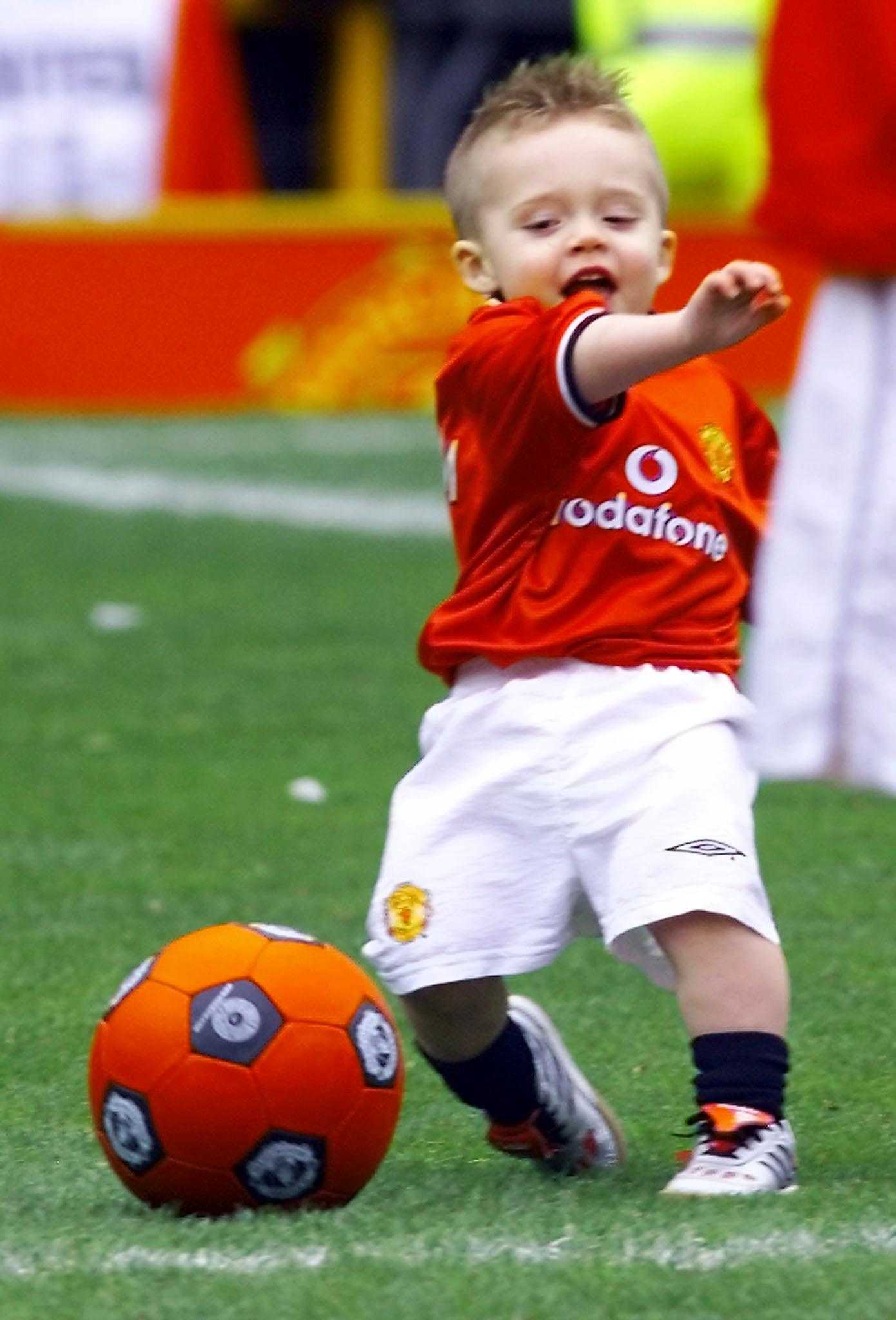 Сын Дэвида и Виктории гоняет мяч во время празднования победы «Манчестера Юнайтед» в Премьер-лиге в 2001 году.