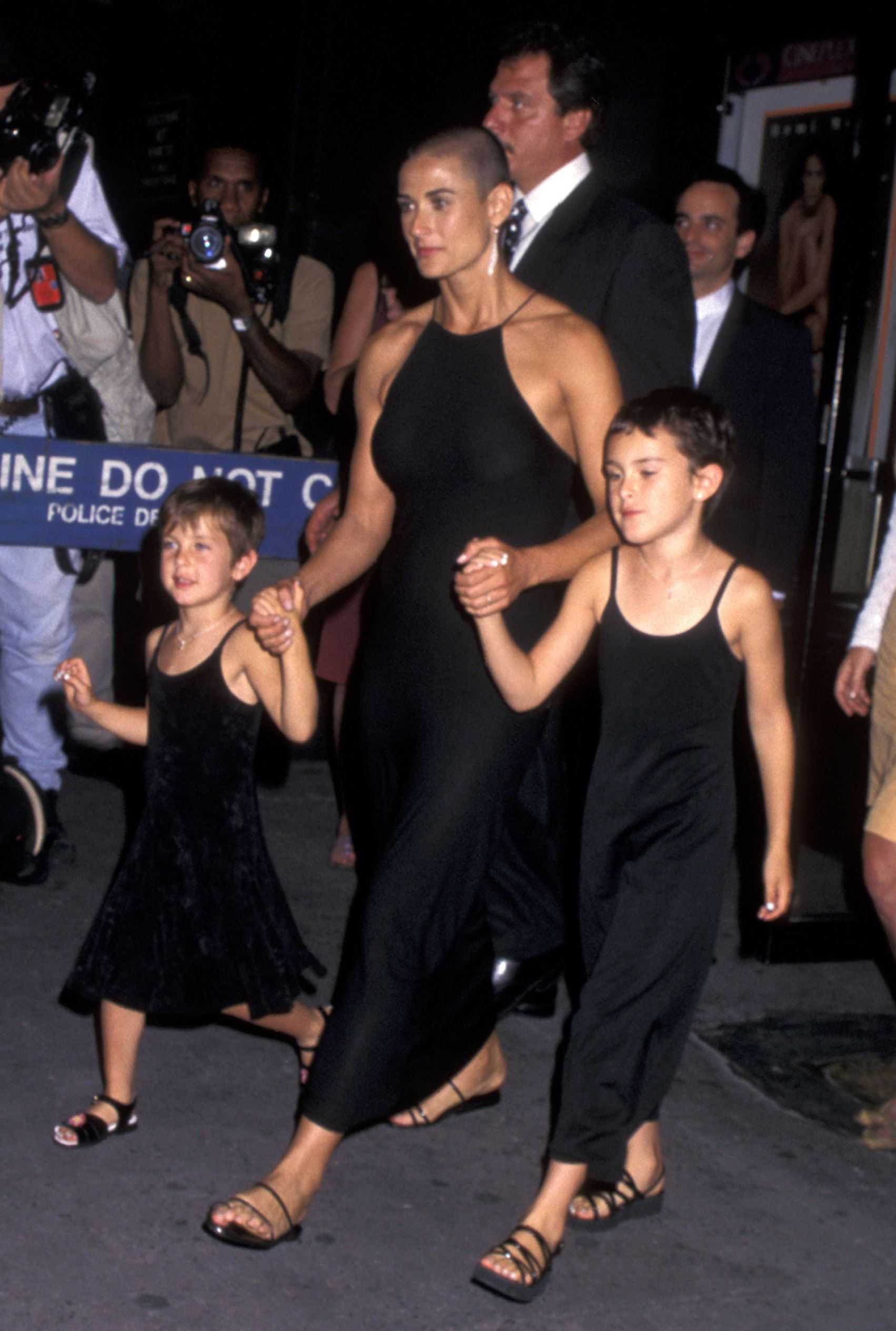 Актриса Деми Мур с дочками: Румер (справа) и Скаут Уиллис на премьере фильма «Стриптиз» в Нью-Йорке в 1996 году.
