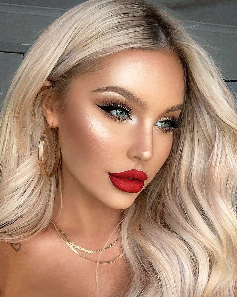 - В голливудском макияже можно делать акцент и на губы, и на глаза. Чтобы мейкап смотрелся гармонично, нужно для смоки айс применять матовую губную помаду, для стрелок на глазах подбирают сияющий блеск. Чаще всего используется ярко-красная помада. Особенностью такого макияжа должны быть яркие губы.