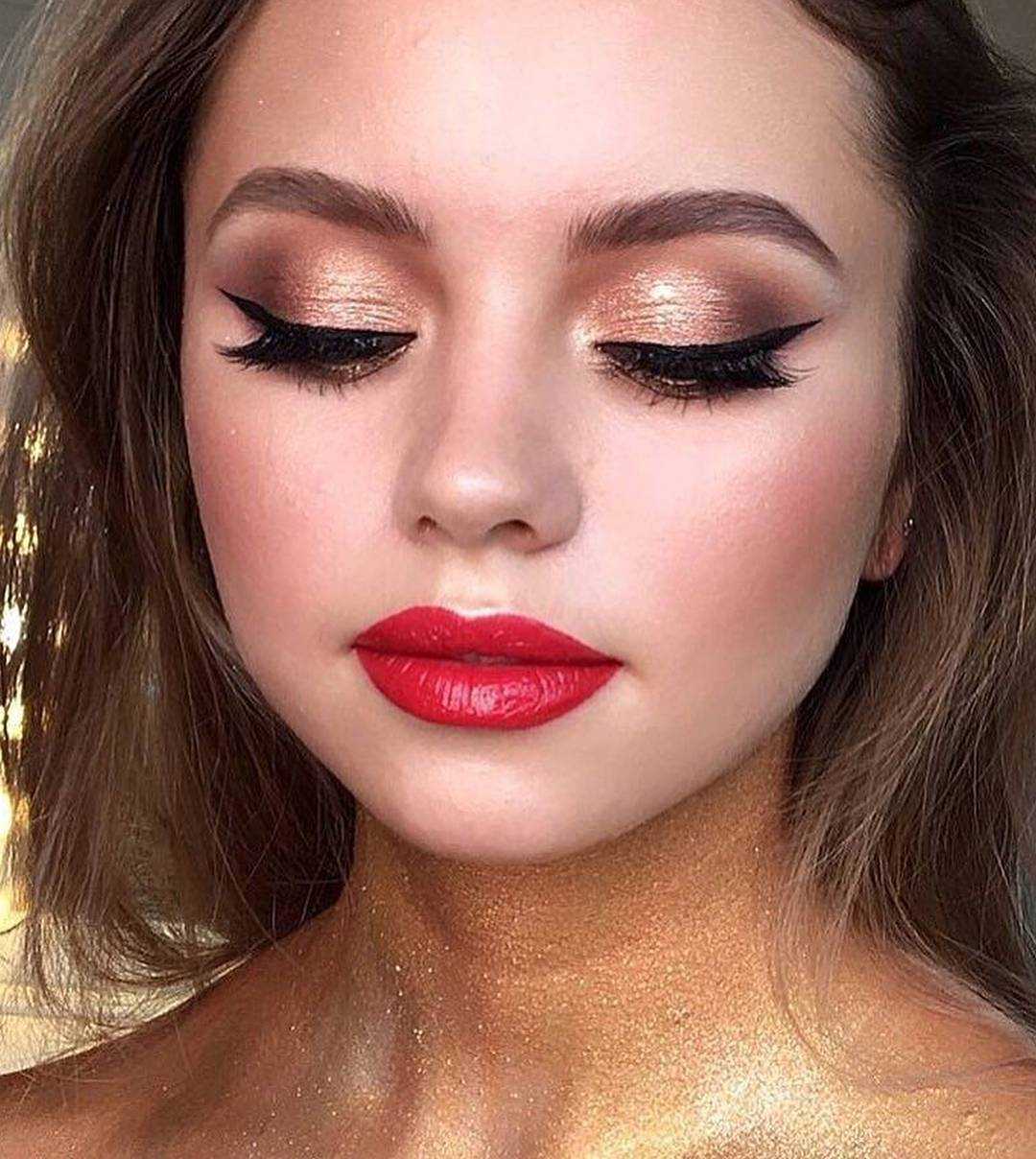 Для торжественных случаев допускается сочетание выразительных глаз с яркими губами. Для создания эффектного образа нужно: