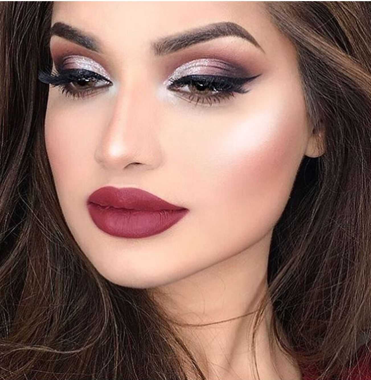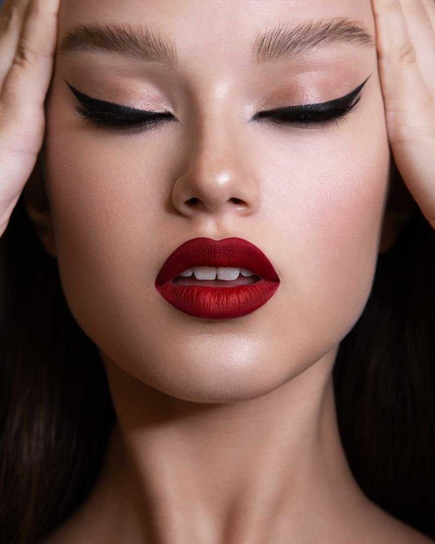 В тон выразительным очертаниям глаз используют темные оттенки губной помады;