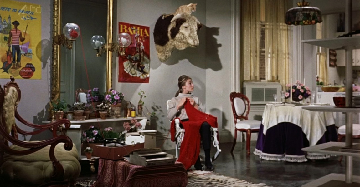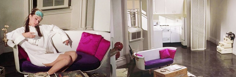 Каждый предмет в манхэттенской квартире Холли Голайтли отражает эксцентричный характера героини. Ковер из зебры на полу, ярко малиновые подушки, телефон в чемодане, голова быка на стене и знаменитый диван в форме ванны. Конечно, в масс-маркете такого дивана не найти, но некоторые приёмы из этого кино-интерьера можно взять на вооружение.