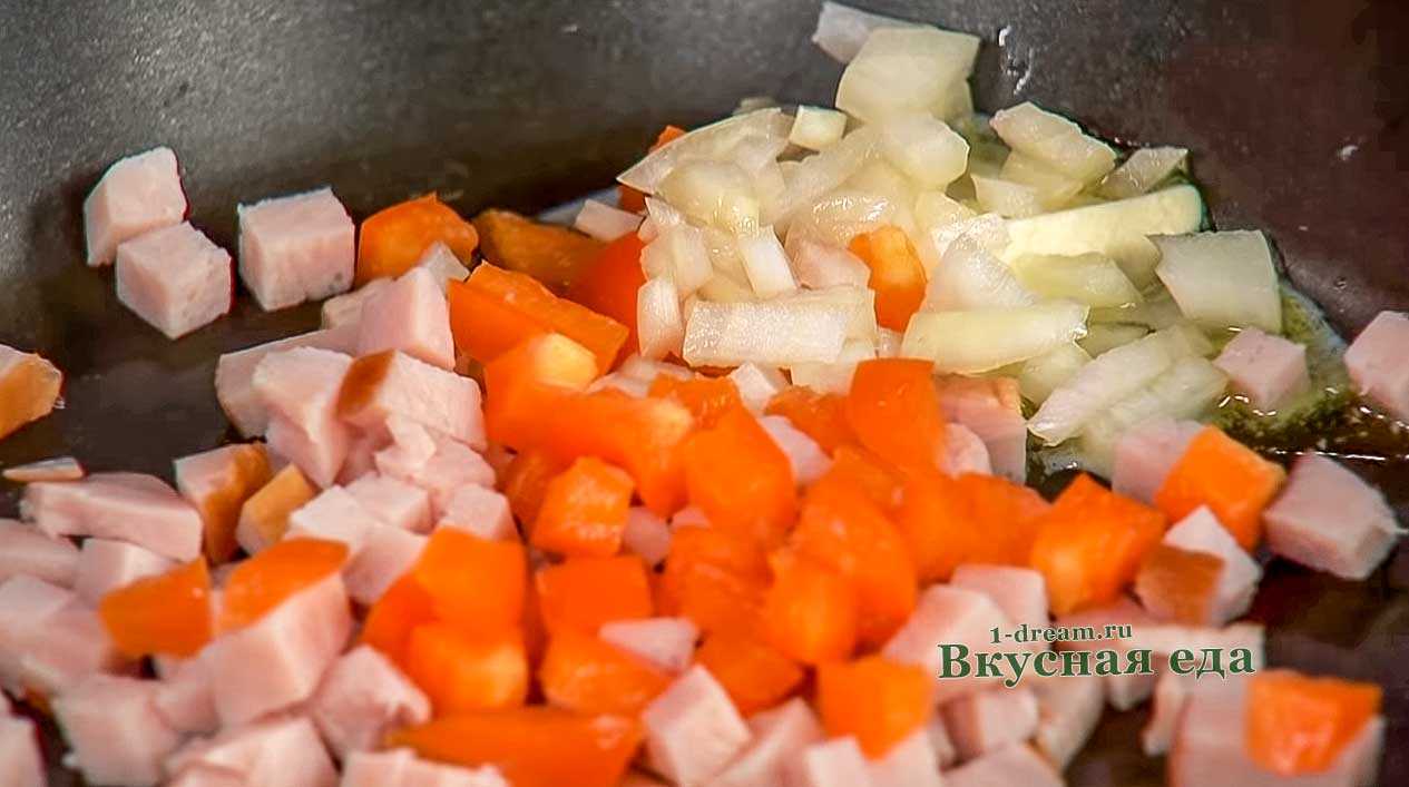 2 столовые ложки сливочного масла, ¼ стакана лука, ½ большого зеленого болгарского перца, ½ крупного красного сладкого перца, 1 чашка ветчины
