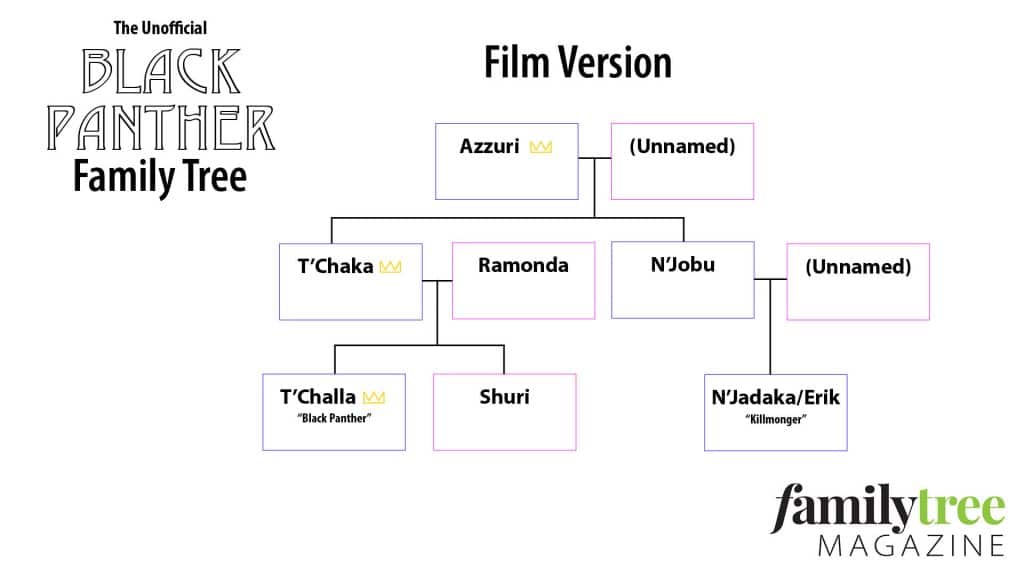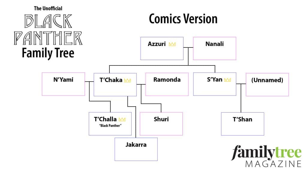 The comics further develop the Black Panther family tree. T’Chaka has a brother, S’Yan, who took over the Black Panther mantle upon T’Chaka’s death. In some versions of Black Panther’s story, T’Challa challenges S’Yan for the throne. T’Challa defeats his uncle, much to the chagrin of S’Yan’s son, T’Shan. (In the comics, N’Jadaka/Erik Killmonger is not related to the Black Panther royal family.)