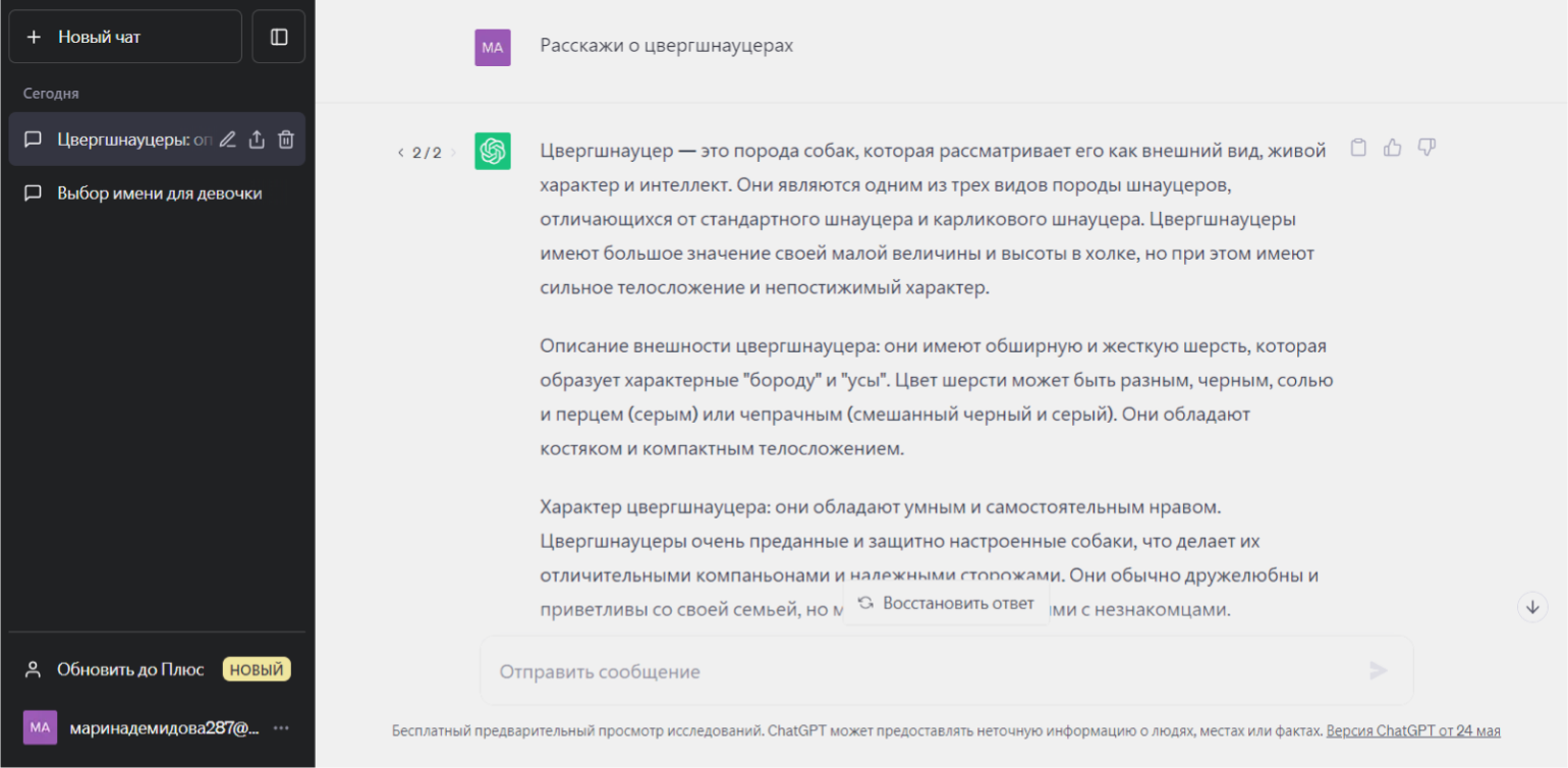 Знаменитый чат-бот от OpenAI с искусственным интеллектом на борту, который может поддерживать диалог, в том числе на русском языке, писать статьи, сочинять стихи, отвечать на вопросы, давать советы и даже спорить. Его ответы можно корректировать с помощью наводящих вопросов.