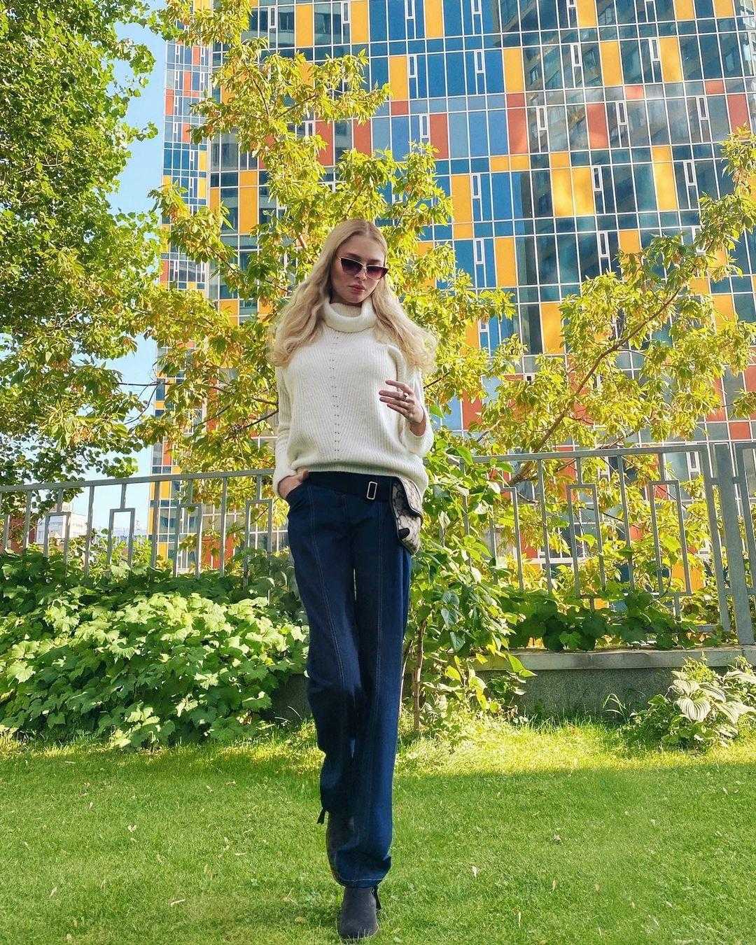В повседневной жизни Алёна Шишкова предпочитает вполне простые и комфортные образы, отдавая предпочтение дениму, худи, свитерам, водолазкам и обуви на плоской подошве. Такой аутфит, состоящий из тёмных джинс и уютного свитера, будет прекрасным решением для осенней прогулки.