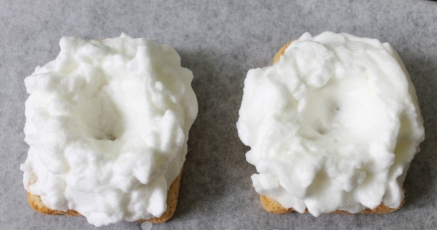 Первым делом из батона надо вырезать кружочки толщиной не менее 1 см и диаметром равным диаметру дна формы. Ломтики подсушить в духовке или слегка обжарить на масле. Уложить поджаренный хлеб на дно формочек.