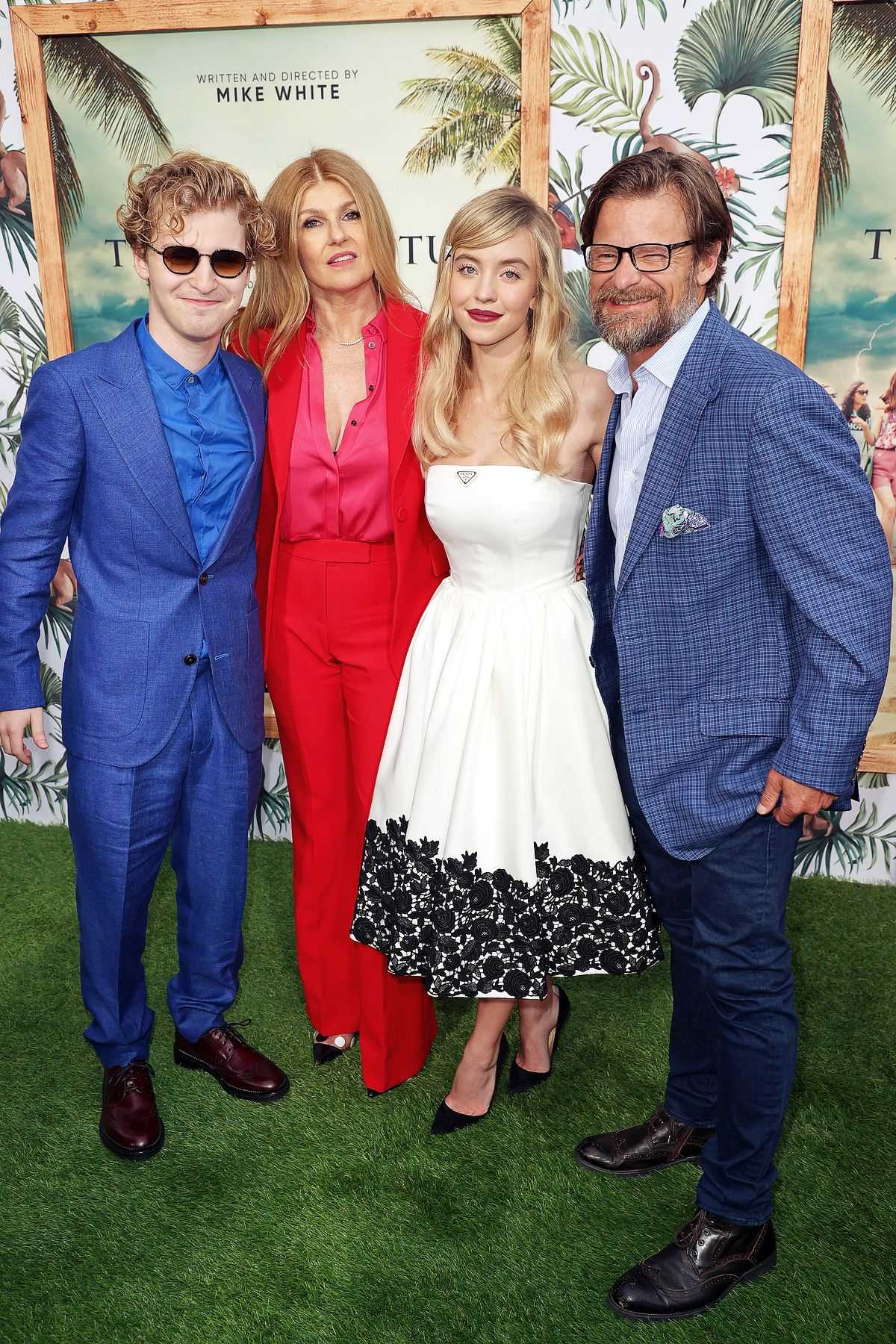 Фред Хечингер, Конни Бриттон, Сидни Суини и Стив Зан на премьере сериала «Белый лотос» в Лос-Анджелесе, 7 июля 2021 г.