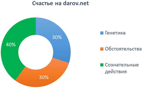 10% – жизненные обстоятельства. Circumstances – «обстоятельства, условия». Многие психологи склоняются к мысли, противоречащей мнению большинства людей, что жизненные обстоятельства играют незначительную роль в том, счастлив ты или нет.