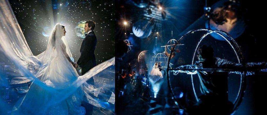 Для организации было задействовано более 300 профессионалов, которые воплотили необычную идею молодоженов. А именно – свадьбу в космическом стиле.