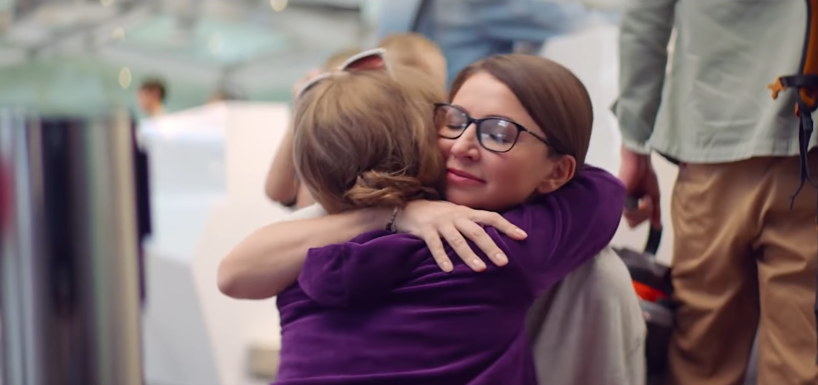 Кадр из фильма «Марафон желаний». Главная героиня обняла Блиновскую в аэропорту, таким образом прикоснулась к бюсту «самой» создательницы марафона